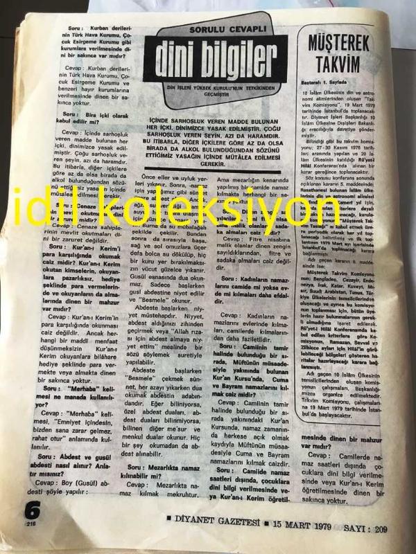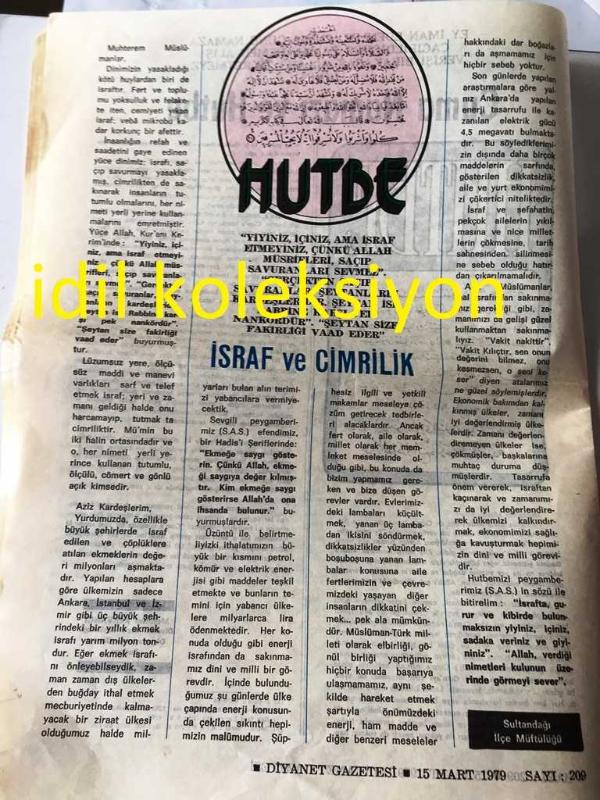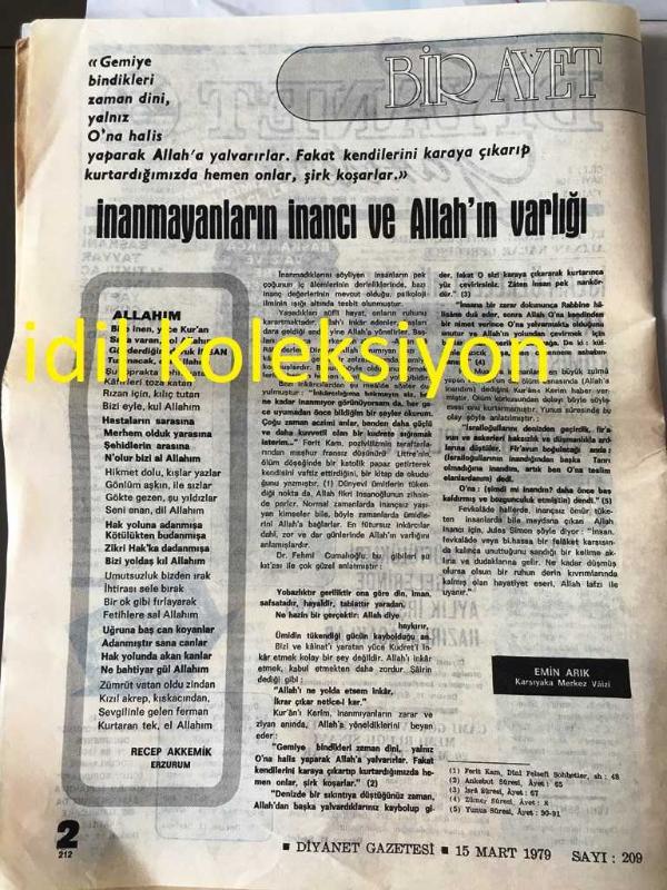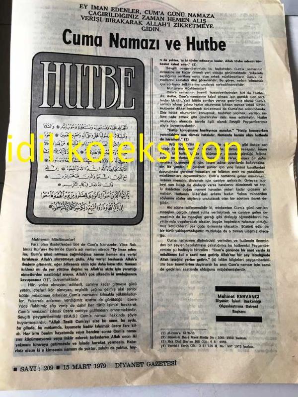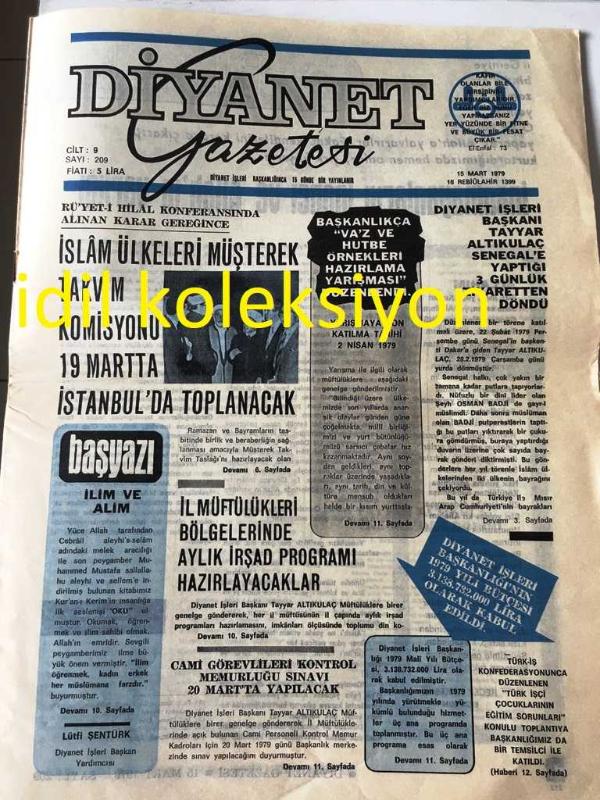 ANKARA DİYANET GAZETESİ YEREL TAŞRA BASINI ----15 Mart 1979 Sayı :209 Yıl :9--İslam Ülkeleri Müşterek Takvim Komisyonu 19 Mart 'ta İstanbul 'da Toplanacak --İl Müftülükleri Bölgelerinde Aylık İrşad Programı Hazırlayacaklar --İnanmayanların İnancı ve Allah 'ın varlığı :Emin Arık --Sabrın verdiği güç :Tahir Çalışkan --İstiklal Marşı da ki Görüşler : Mehmet Okutan --Cuma Namazı ve Hutbe :Mehmet Kervancı :Diyanet İşleri Başkanlığı Olgunlaşma Dairesi Başkanı --Selahattin Hoca 'nın Şahadeti : Abdülkadir Sezgin -- Yıpranma, sararmalar, kupon kesiği ve yırtılmalar zamana bağlı olarak görülebilir.