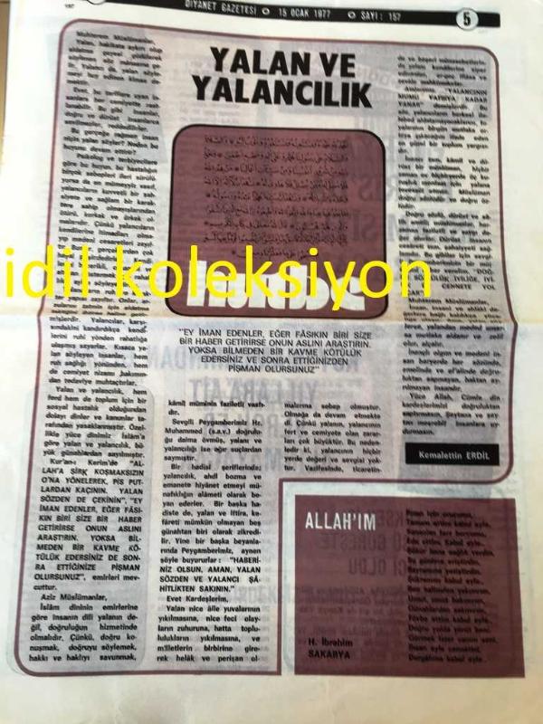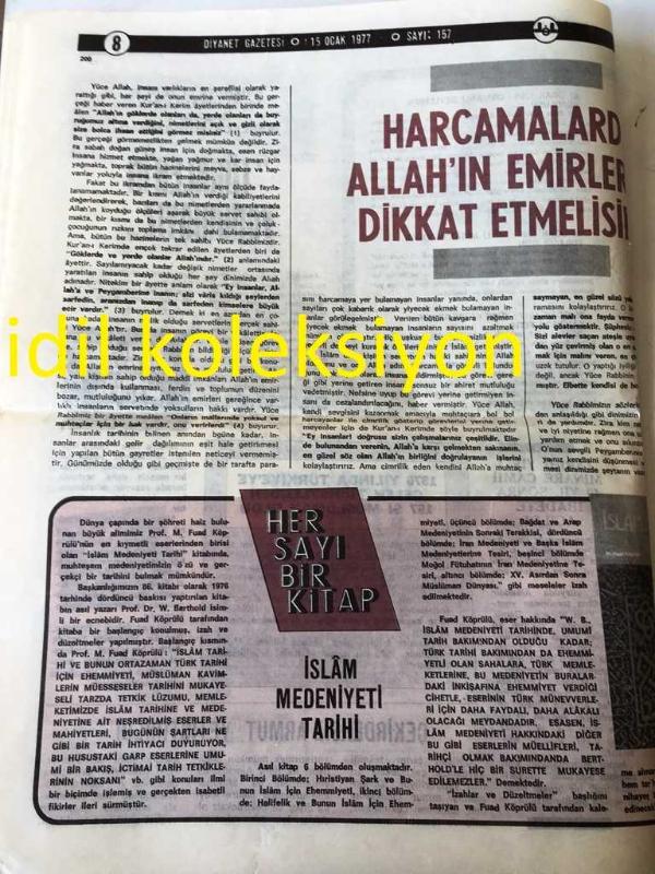 ANKARA DİYANET GAZETESİ YEREL TAŞRA BASINI ----- 15 Ocak 1977 Yıl :8 Sayı :157--İslam ülkeleri arası Kuranı Kerim Tilaveti toplantısı Konya ve Erzurum 'da yapıldı --Kuranı Kerim 'den Öğütler --Hz Muhammed ve Eğitimi --ALLAH 'IM :H.İbrahim Sakarya --Libya Kıbrıs 'ta İslam Sitesi Kuracak ---Köy imamlarından geçmiş yıllara ait vergiler alınmayacak --Türkler 'in Yanındayız ---Nimete şükür gerekir --İslam Dini ve Ticaret --Nadir Serin --Veremle Savaş :Mesut Sözen -- Yıpranma, sararmalar, kupon kesiği ve yırtılmalar zamana bağlı olarak görülebilir.
