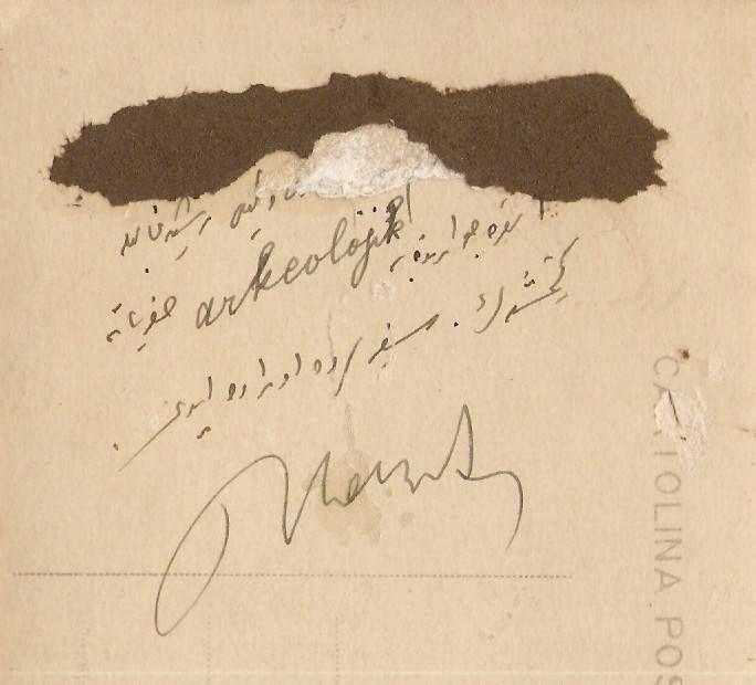** OSMANLICA YAZILI ARKEOLOJİ KONULU FOTOĞRAF ** Kartpostal ebadında,arkası Osmanlıca yazılı,iyi kondüsyonda fotoğraf.. Elinde gözlük olan ve bilgi verilen kişi Atatürk'e ne kadar benziyor...