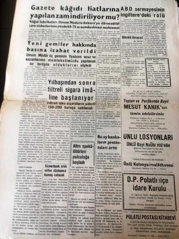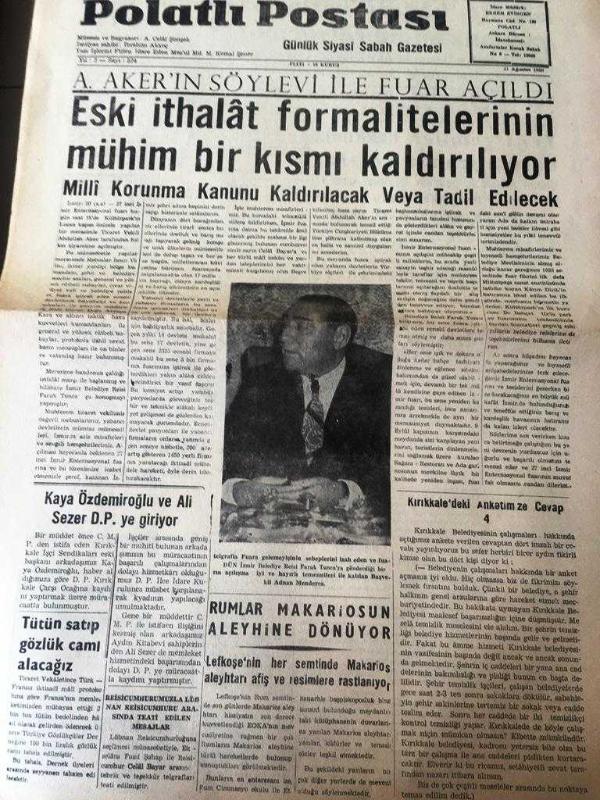 ANKARA POLATLI POSTASI GAZETESİ YEREL TAŞRA BASINI --21 Ağustos 1958 YIL :2 SAYI :524- A.Aker 'in Söylevi ile Fuar Açıldı -Eski ithalat formalitelerinin mühim bir kısmı kaldırılıyor - Kaya Özdemiroğlu ve ALİ Sezer Demokrat Parti ye Giriyor - -Rumlar Makariosun Aleyhine Dönüyor --Gazete kağıdı fiyatlarına yapılan zam indiriliyor mu ?Yeni gemiler hakkında basına izahat verildi - Yılbaşından sonra filtreli sigara imaline başlanıyor - ABD sermayesinin İngiltere de ki rolü - Yıpranma, sararmalar, kupon kesiği ve yırtılmalar zamana bağlı olarak görülebilir.