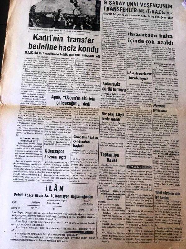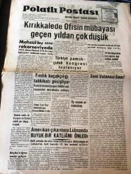 ANKARA POLATLI POSTASI GAZETESİ YEREL TAŞRA BASINI --9 Ağustos 1958 YIL :2 SAYI :514- Mahsül bu sene rekor seviyede - Türkiye de pamukçuluk kongresi toplanıyor - Fındık kaçakçılığı tahkikatı genişliyor --Amerikan çıkarması Lübnan da Büyük Bir Katliamı Önledi - 14 bin hayvana koruyucu aşı tatbik edildi - Seni Vatansız Seni : A. Celal Şimşek - Kadri 'nin transfer bedeline haciz kondu - Güneş Spor Sezonu Açtı --Galatasaray Ünal ve Şengunun Transferlerine İtiraz Ediyor - Lastik serbest bırakılıyor ---İhracat son hafta içinde çok azaldı -- Yıpranma, sararmalar, kupon kesiği ve yırtılmalar zamana bağlı olarak görülebilir.