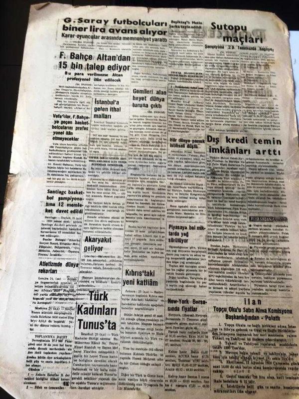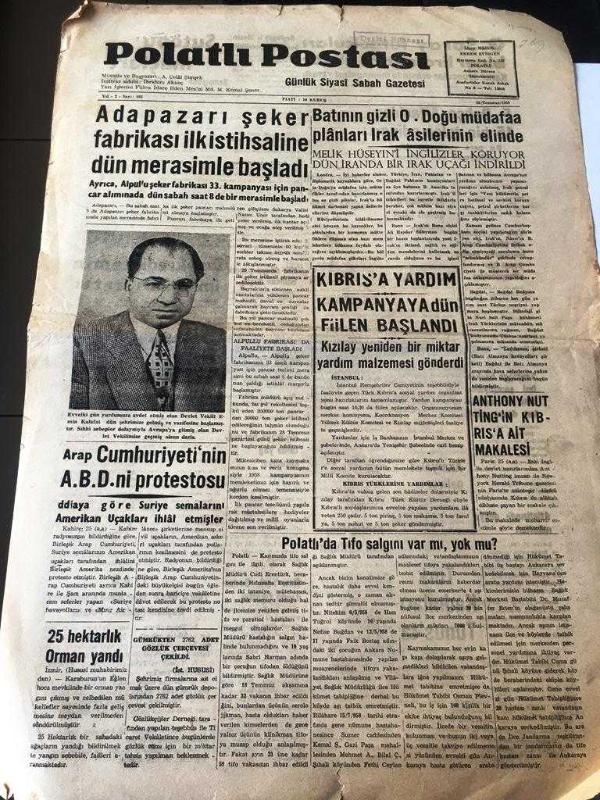 ANKARA POLATLI POSTASI GAZETESİ YEREL TAŞRA BASINI YEREL TAŞRA BASINI--26 Temmuz 1958 Yıl :2 SAYI :503- Adapazarı şeker fabrikası ilk istihsaline dün merasimle başladı --Arap Cumhuriyeti 'nin A.B.D Protestosu - Batının gizli Orta Doğu Müdafaa Planları Irak Asillerinin Elinde -Kıbrıs 'a Yardım Kampanya ya dün fiilen başlandı -- Anthony Nutting 'in Kıbrıs 'a Ait Makalesi -Polatlı da Tifo Salgını Var mı ,Yok mu ?--Galatasaray futbolcuları biner lira avans alıyor - Fenerbahçe Altan 'dan 15 bin talep ediyor - İstanbul 'a Gelen İthal Mallar - Dış kredi temin imkanları arttı --Türk Kadınları Tunus 'ta ---Sutopu Maçları Şampiyona 29 Temmuz da Başlıyor -- Yıpranma, sararmalar, kupon kesiği ve yırtılmalar zamana bağlı olarak görülebilir.