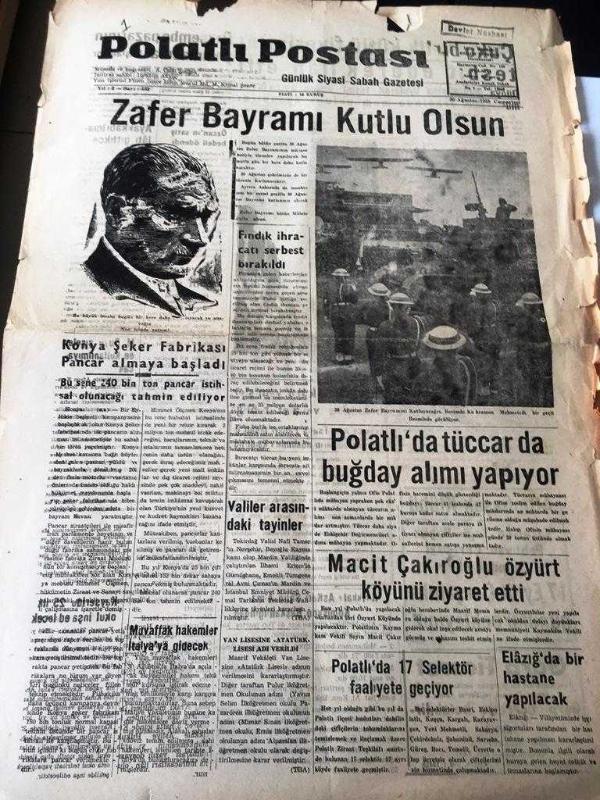 ANKARA POLATLI POSTASI GAZETESİ YEREL TAŞRA BASINI YEREL TAŞRA BASINI -30 AĞUSTOS 1958 YIL :2 SAYI :532-Zafer Bayramı Kutlu Olsun - Fındık ihracatı serbest bırakıldı - Konya Şeker Fabrikası Pancar Almaya Başladı- Polatlı da tüccar da buğday alımı yapıyor - Macit Çakıroğlu Özyurt Köyünü Ziyaret Etti - Valiler arasında tayinler --Polatlı 'da 17 Selektör Faaliyete Geçiyor - Elazığ da bir hastane yapılacak--Çuko birlik kütlü fiyatlarını tespit ederek ilan etti - Yıpranma, sararmalar, kupon kesiği ve yırtılmalar zamana bağlı olarak görülebilir.