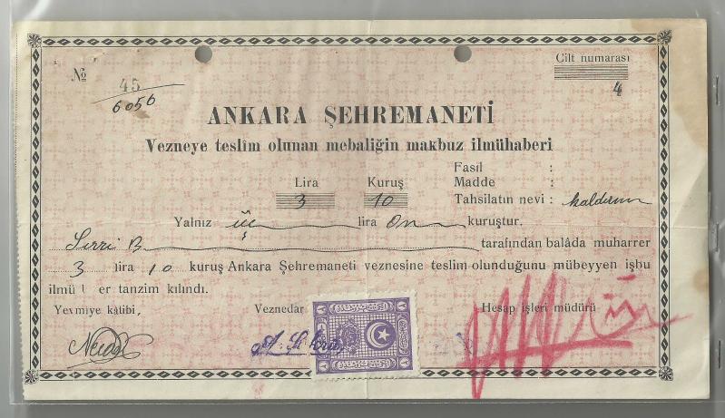 ** ANKARA ŞEHREMANETİ MAKBUZU ** Tarih yazılmamış nedense,gayet temiz vaziyette belediye makbuzudur.. Sanırım yine 1930'lu senelerdir...