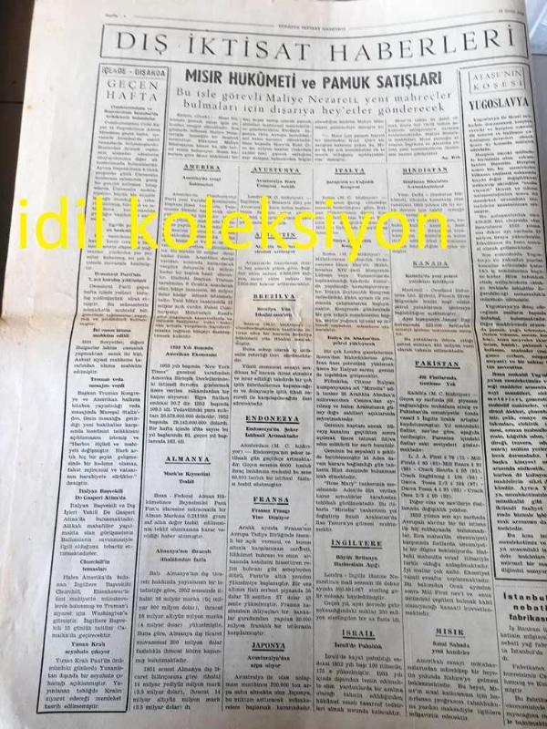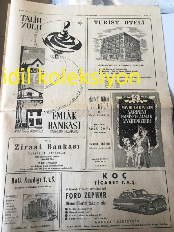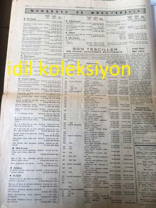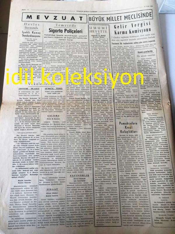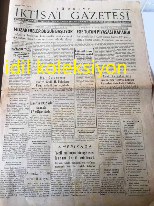 ANKARA TÜRKİYE İKTİSAT GAZETESİ YEREL TAŞRA BASINI --12 OCAK 1953 YIL :1 Sayı :2--Müzakereler Bugün Başlıyor --Cumhur Reisimiz ile Baş Vekilimizin İstanbul Ticaret Odamızı Ziyareti ---Maliye vekili Hasan Polatkan Vergi Tahsilatını Açıkladı - İzmir 'in 1952 Yılı İhracatı 17 Milyon Fazla --Ege Tütün Piyasası Kapandı --Gelir Vergisi Karma Komisyonu --Cumhur Reisimiz Bayar ve Başvekilimiz Menderes Çatımız Altında İstihsal ve Dış Ticaretimiz---Mısır Hükümeti ve Pamuk Satışları --Birliğimizde Muamele Vergisi Kanun Tasarısı -- Kore Harbinin Tesirleri Zail Oldu --1953 İlk 3 Ayı İçin Dünya Bakır Tahsisleri --- Yıpranma, sararmalar, kupon kesiği ve yırtılmalar zamana bağlı olarak görülebilir.