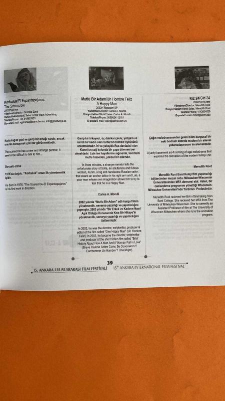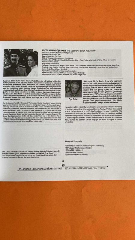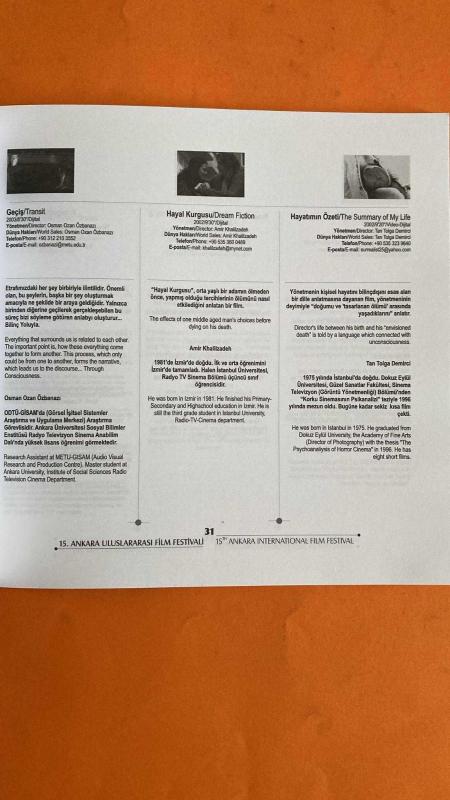 ANKARA ULUSLARARASI FİLM FESTİVALİ DERGİSİ - ARALIK 2003 - ANKARA ULUSLARARASI FİLM FESTİVALİ - HALİT REFİĞ - İNCİ DEMİRKOL - OĞUZ ONARAN - AYSAN SÜMERCAN - ZÜLFÜ LİVANELİ - ALİ KARADOĞAN - SELDA SALMAN - CAN ERTUNA - CUMHUR CANBAZOĞLU - ZÜLFÜ LİVANELİ - OKTAY BULGAY - YASEMİN KIRMACI - ZEYNEP ATAKAN - YUNUS ADIGÜZEL - TEOMAN VARDAR - ENVER KOLAÇ - LİDER ANAÇ - AKIN CANKO - FAHRİ KAPLAN - BORA TÜRKKAN - SİBEL K. TÜRKER - MUAMMER ŞANLI - ENDER AYDIN - BÜLENT GÜNDÜZ - SERDAR AYGÜN - HAKAN PAŞALI - ELİF KAYNAR - ZİYA ÖZTAN - DERVİŞ ZAİM - REİS ÇELİK - ÖMER KAVUR - HAKAN HAKSUN - ERCAN DURMUŞ - YÜKSEL YAVUZ - ÜMİT CİN GÜVEN - TAN TOLGA DEMİRCİ - AMİR KHALILZADEH - OSMAN OZAN ÖZBANAZİ - GONZALO ZONA - CARLOS A. MORELLI - MEREDITH ROOT - ABDÜLHAMİD DÜŞERKEN - ÇAMUR - İNAT HİKAYELERİ - KARŞILAŞMA - KOLAY PARA - KÜÇÜK ÖZGÜRLÜK - METROPOL KABUSU - GEÇİŞ - HAYAL KURGUSU - HAYATIMIN ÖZETİ - KORKULUK - MUTLU BİR ADAM - KIZ 24 - AZİZ NESİN EMEK ÖDÜLÜ - ULUSAL UZUN FİLM YARIŞMASI - ULUS - 115 SAYFA adlı eser Türkçe dilindedir.