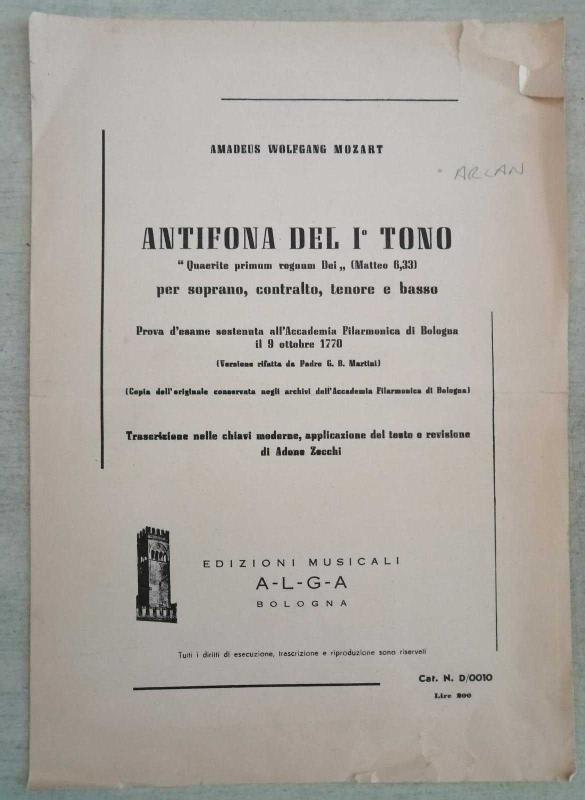 ANTIFONA DELI TONO - "QUAERITE PRIMUM REGNUM DEI" (MATTEO 6,33) PER SOPRANO, CONTRALTO, TENORE E BASSO, AMADEUS WOLFGANG MOZART tarafından kaleme alınmıştır. Kitap EDIZIONI MUSICALI tarafından [İTALYA] yayınlanmıştır. 3 sayfadır. ANTIFONA DELI TONO - "QUAERITE PRIMUM REGNUM DEI" (MATTEO 6,33) PER SOPRANO, CONTRALTO, TENORE E BASSO adlı eser İtalyanca dilindedir.