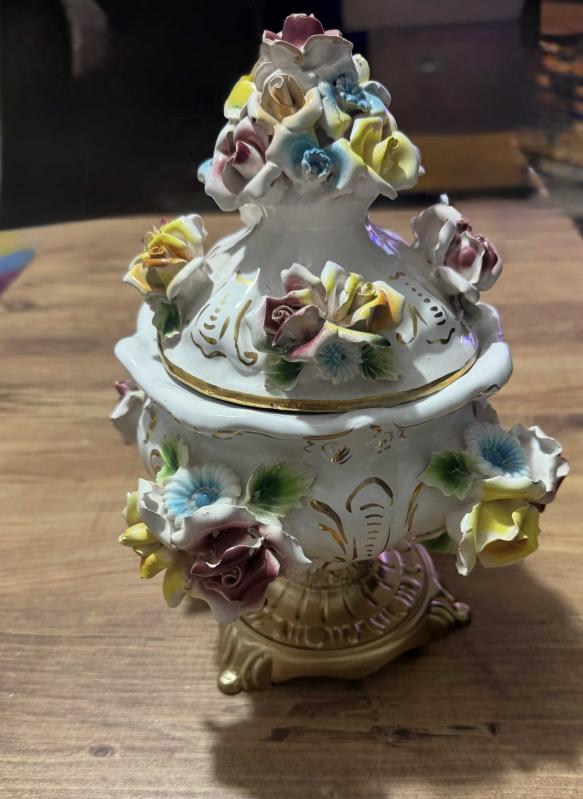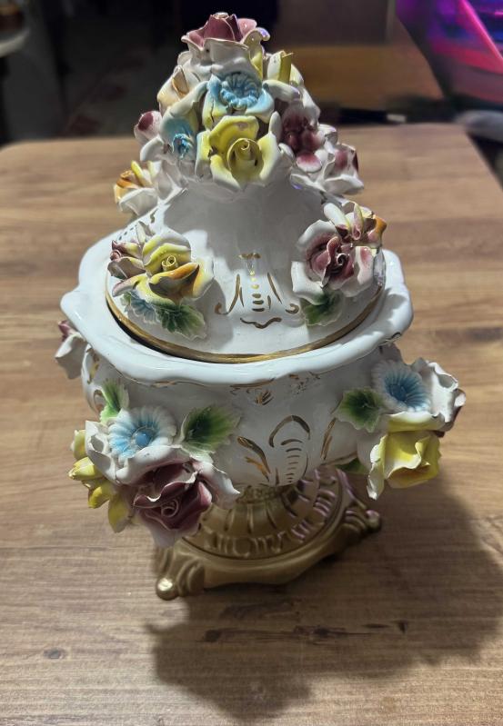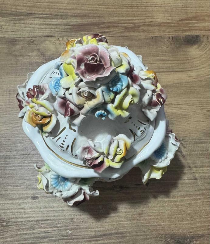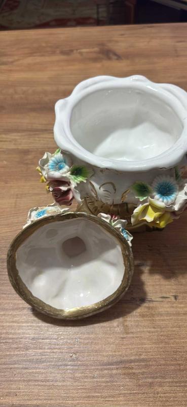 ANTİKA BAROK PORSELEN KAPAKLI PİRİNÇ AYAKLI ŞEKERLİK / BİSKÜVİLİK – EL YAPIMI ÇİÇEK FİGÜRLÜ El boyaması ve kabartma çiçek detaylarıyla süslenmiş, oldukça zarif görünüme sahip kapaklı Pirinç ayaklı porselen şekerlik / bisküvilik. Porselen El yapımı çiçek aplikeleri, el boyama detaylar Klasik / Barok / Capodimonte Kapağında ufak atık var rahatsız edici değil Kapaklı 26 cm Kapaksız 15 cm Ağız çapı 15 cm, 19 saat önce kitantik’te satışa sunulmuştur.