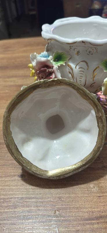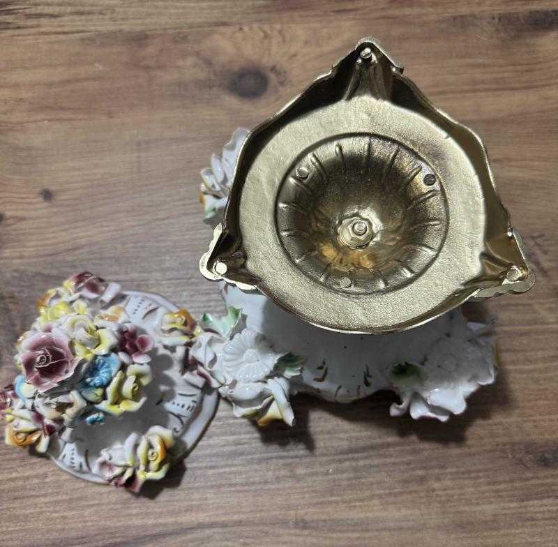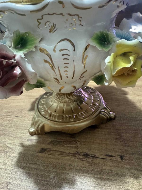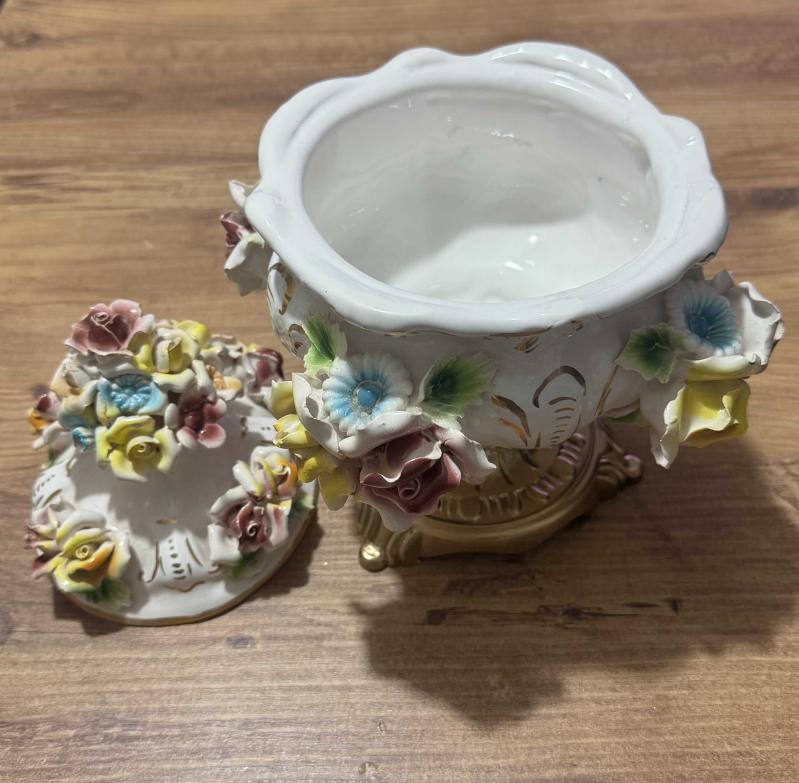 ANTİKA BAROK PORSELEN KAPAKLI PİRİNÇ AYAKLI ŞEKERLİK / BİSKÜVİLİK – EL YAPIMI ÇİÇEK FİGÜRLÜ El boyaması ve kabartma çiçek detaylarıyla süslenmiş, oldukça zarif görünüme sahip kapaklı Pirinç ayaklı porselen şekerlik / bisküvilik. Porselen El yapımı çiçek aplikeleri, el boyama detaylar Klasik / Barok / Capodimonte Kapağında ufak atık var rahatsız edici değil Kapaklı 26 cm Kapaksız 15 cm Ağız çapı 15 cm