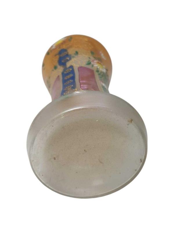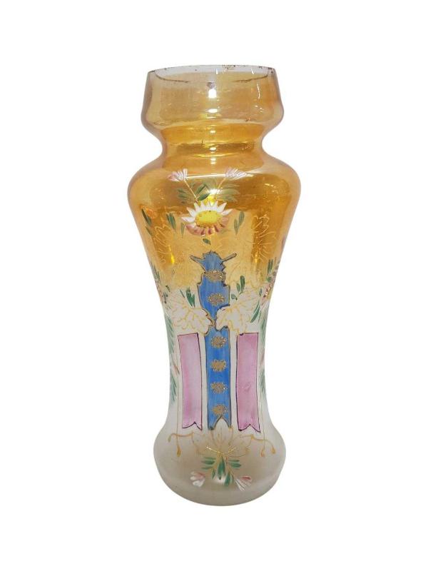 1900'LERDEN ÇEKOSLAVAK YAPIMI BOHEM CAM ÜZERİ MİNE İŞÇİLİKLİ VE EL BOYAMA ÇİÇEKLERLE SÜSLÜ VAZO. AĞIZ KISMINDA ÇOK MİNİK ATIKLAR VAR. YÜKSEKLİK: 28,5 CM