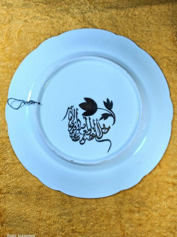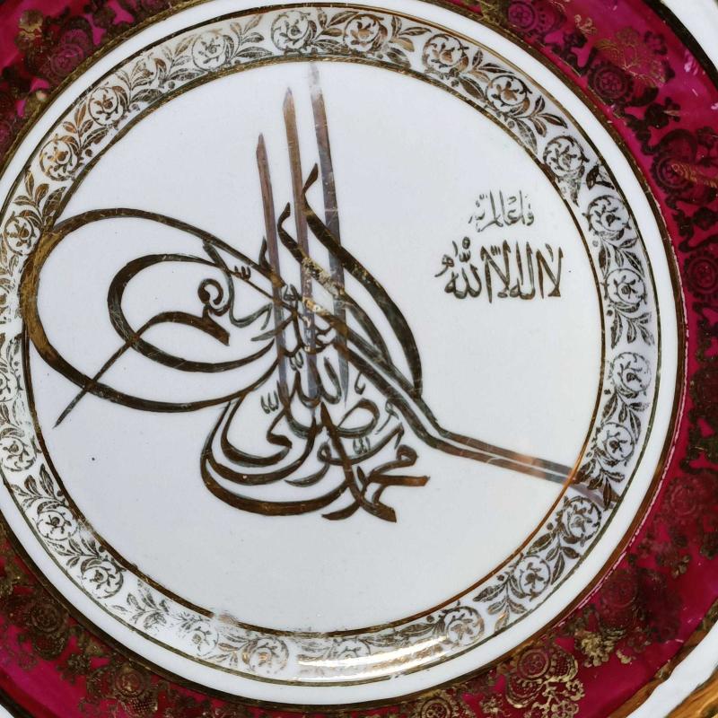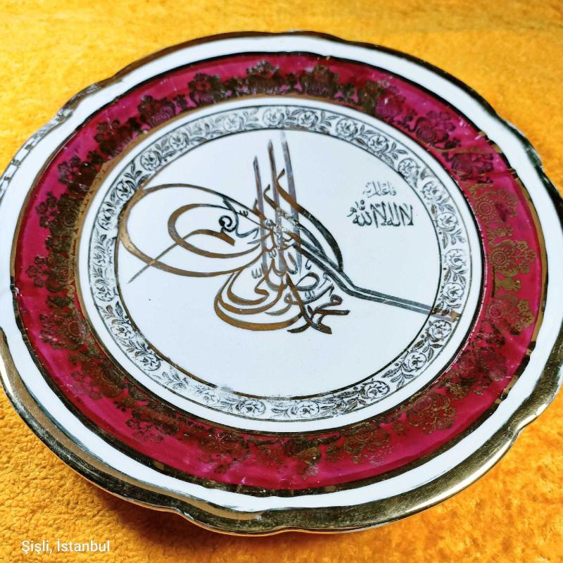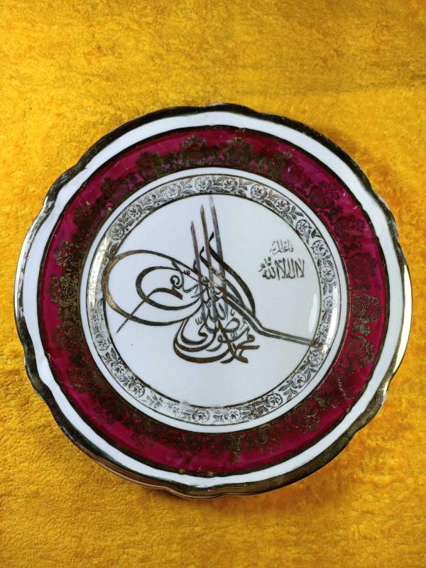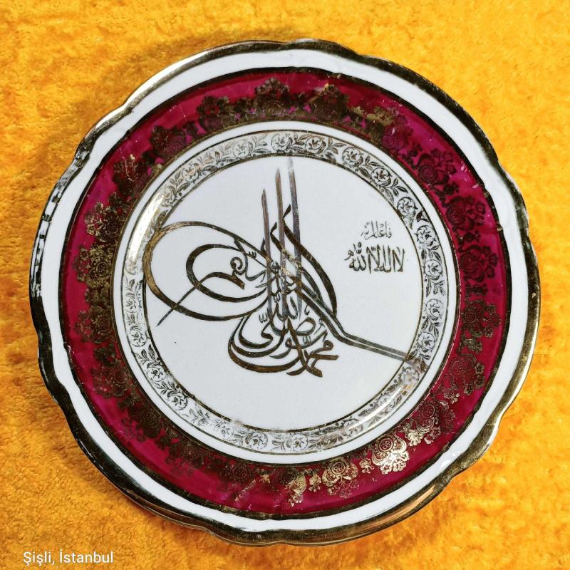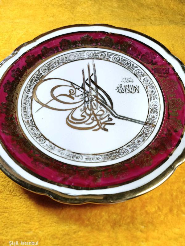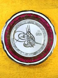 ÇAP 20,7 cm , ALTIN YALDIZ OSMANLI TUĞRA İŞLEMELİ , BORDO RENKLİ BORDÜRLÜ , ARKASI YAZILI . KIRIK ÇATLAK YOK . ESKİLİKTEN KAYNAKLI YALDIZLI BİRİKİ YERDE ÇOK HAFİF AŞINMA VAR . ANTİKA .