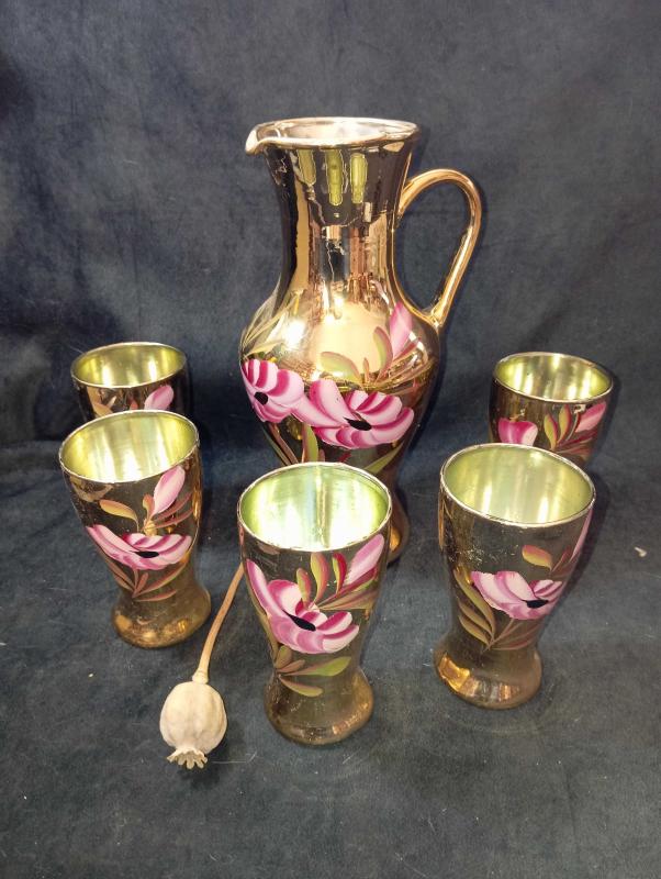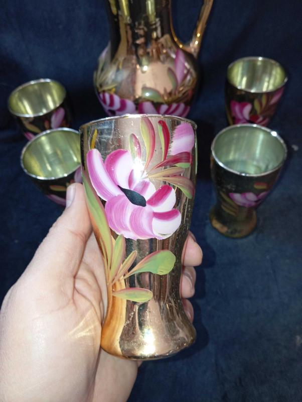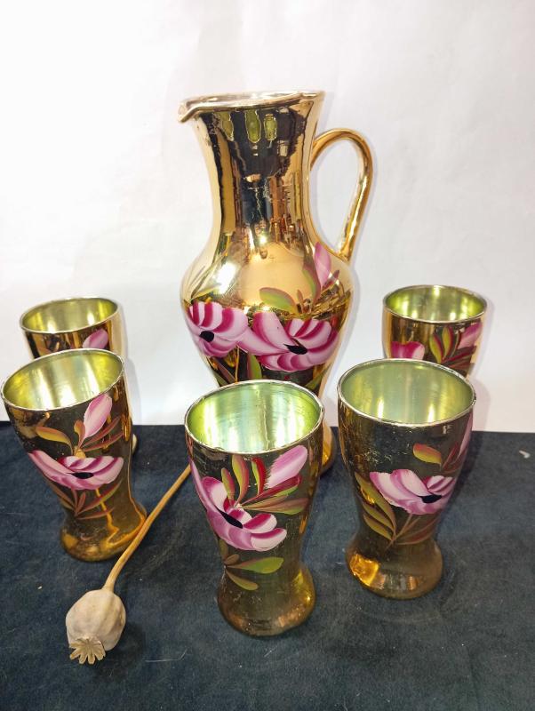 ANTİKA GELİN ŞERBET TAKIMI- SÜRAHİ VE 5 BARDAK. CAM- EL BOYAMA RESİMDLERDEKİ HALİ İLE KIRIK ÇATLAK YOK