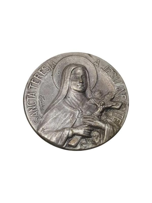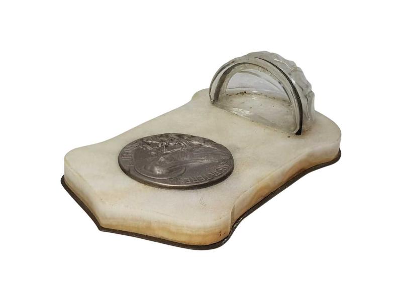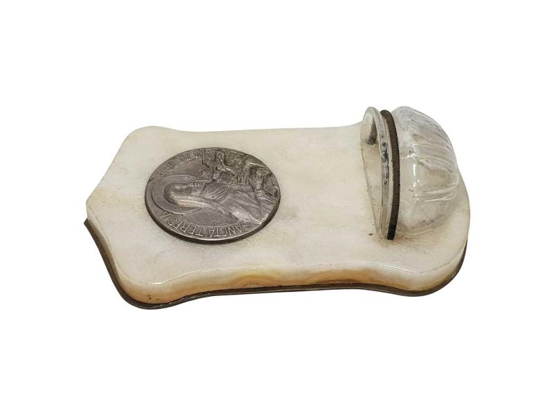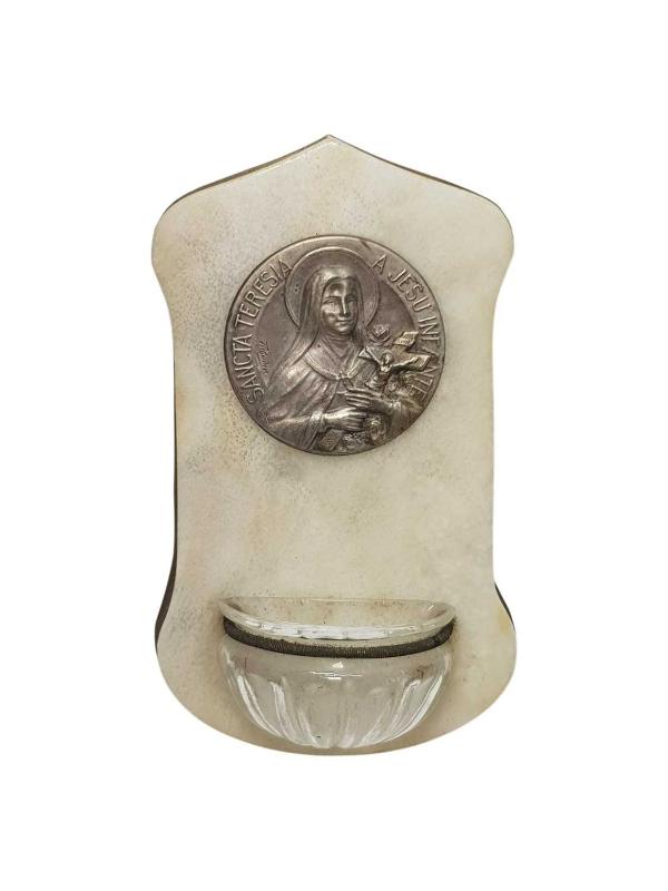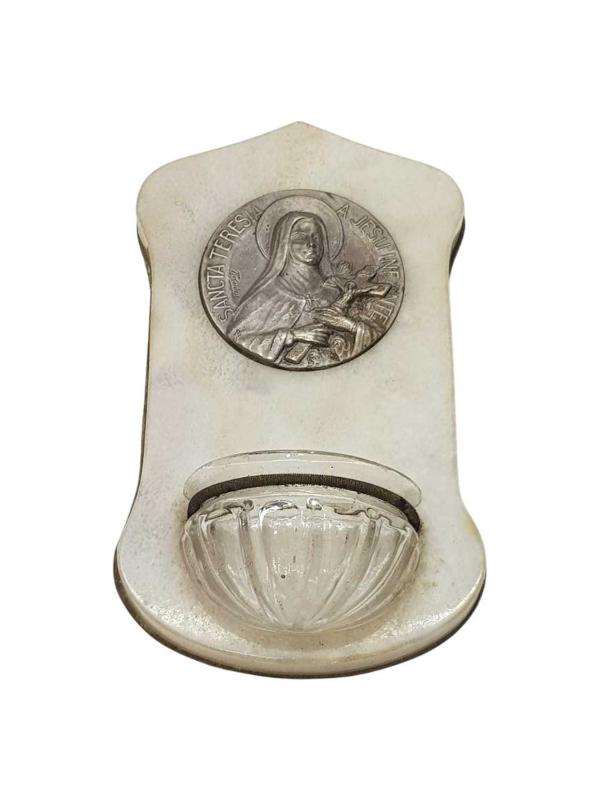 1900'LERDEN MERMER ÜZERİ MERYEM ANA TEMALI BİR MADALYON VE ALTINDA KUTSAL SU HAZNESİ OLAN, ARKA KISMI PİRİNÇ PLAKA İLE KAPLI NADİR DUVAR İKONASI YÜKSEKLİK: 18 CM