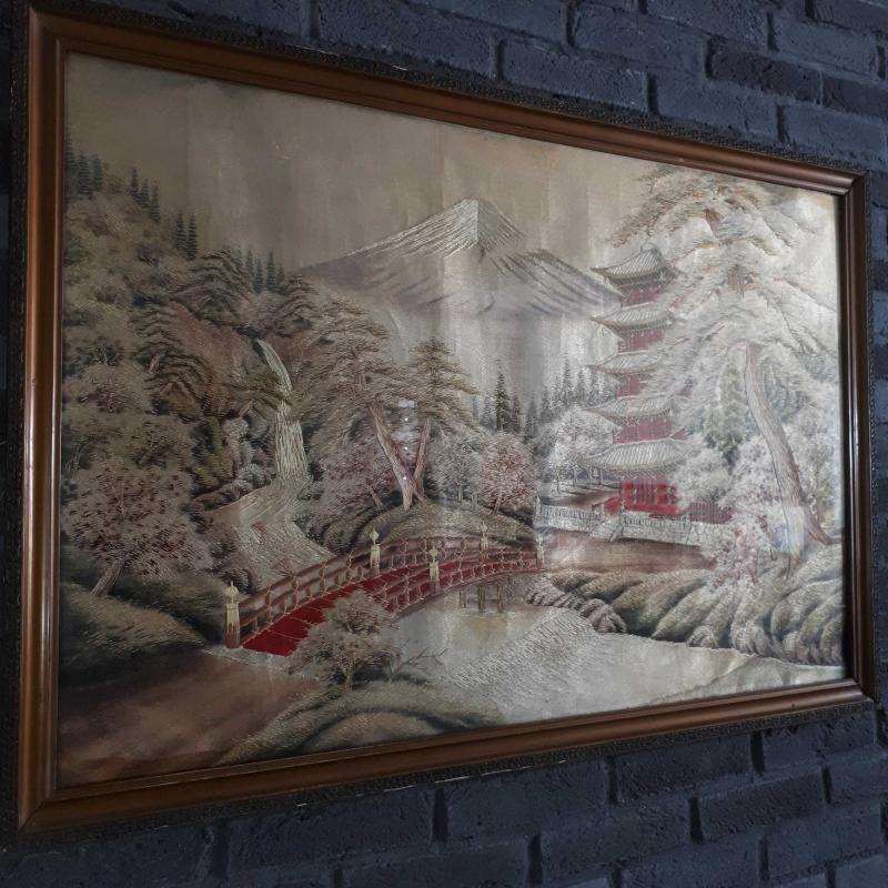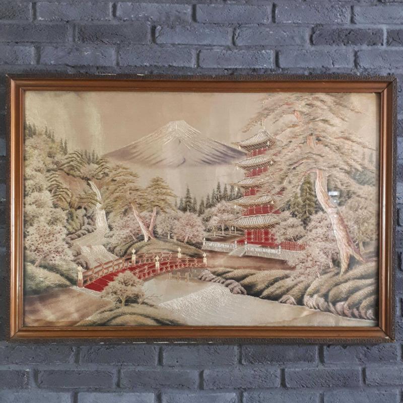 EL İŞLEME BEZ PANO 1940 LARDAN , ÇERÇEVE 1950 LERDEN . ÇERÇEVELİ ÖLÇÜLERİ 98 x 68 cm . KUTSAL FUJİ DAĞI VE ŞİNTOİZMİN TEMELİ İLK BUDİST TAPINAĞI GÖRSELLİ . CAM DAHİL HERŞEY ORJİNAL . RENKLERDE SOLMA YOK . KUSURSUZ .