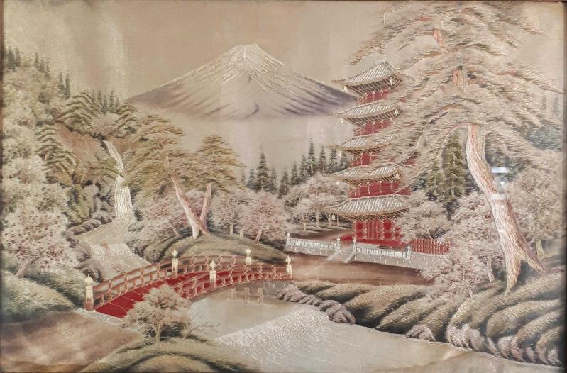 ANTİKA , JAPONYA FUJI DAĞI VE CHUREITO PAGODA ANTİK BUDİST TAPINAĞI TASVİRLİ EL İŞLEME İPEK KANAVİÇE , ORJİNAL ÇERÇEVESİNDE TABLO , 98 x 68 cm başlıklı antika/koleksiyon objesi Uzak Doğu menşe’lidir. 1940-1959 arası dönemine aittir.