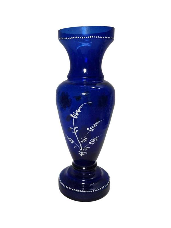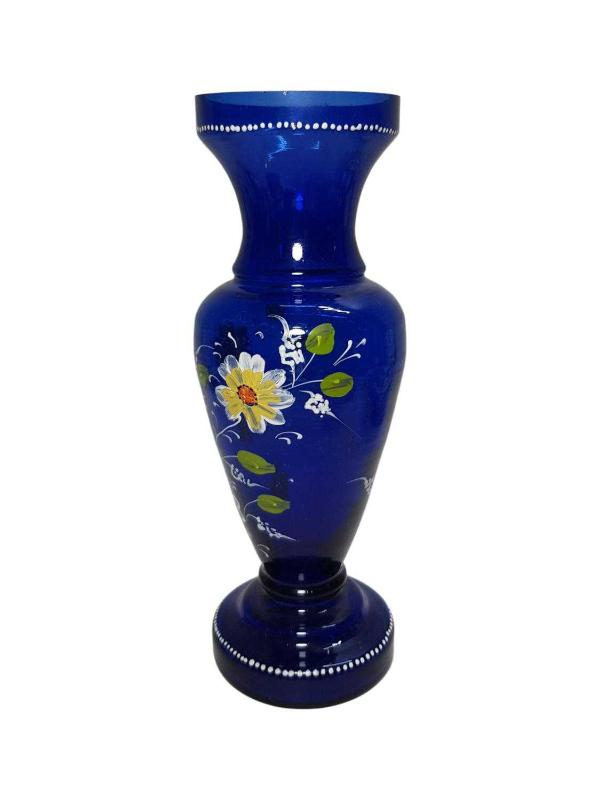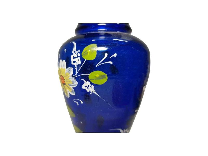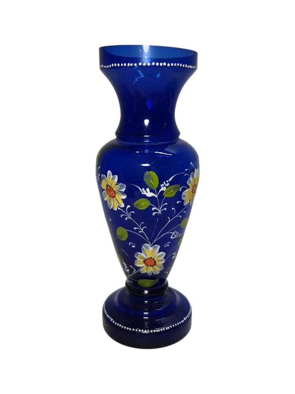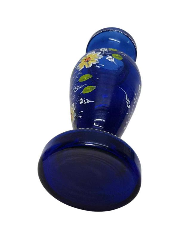 ÜZERİ EL BOYAMA ÇİÇEK DESENLERİYLE SÜSLÜ KOBALT CAM VAZO YÜKSEKLİK: 21 CM