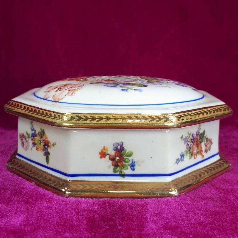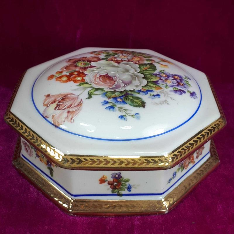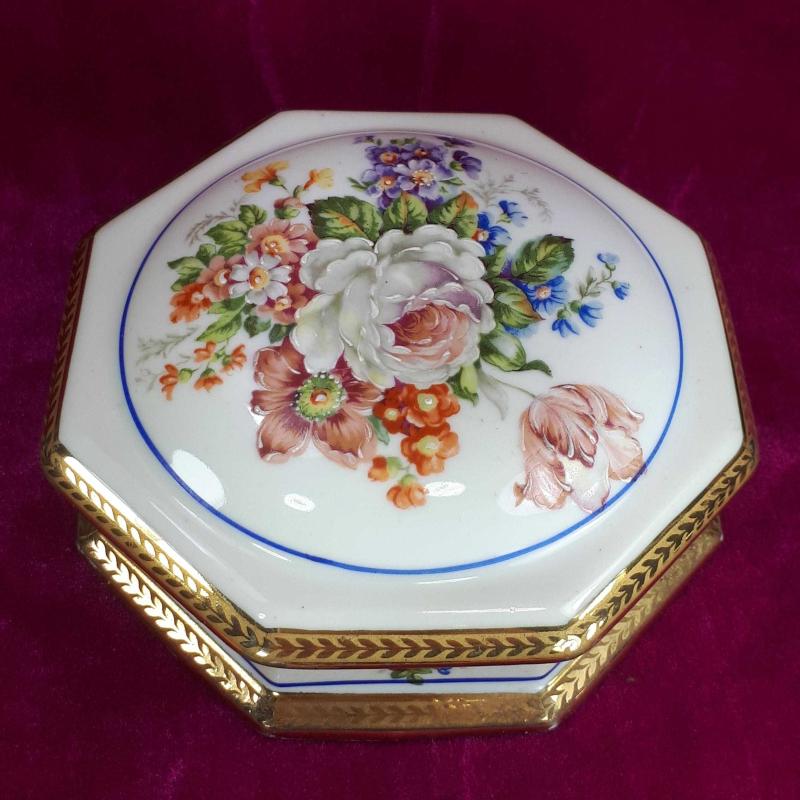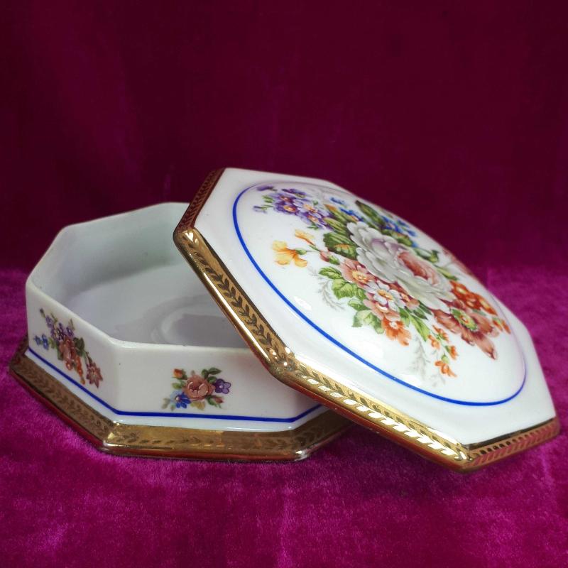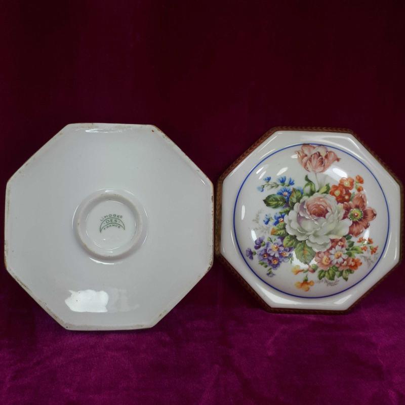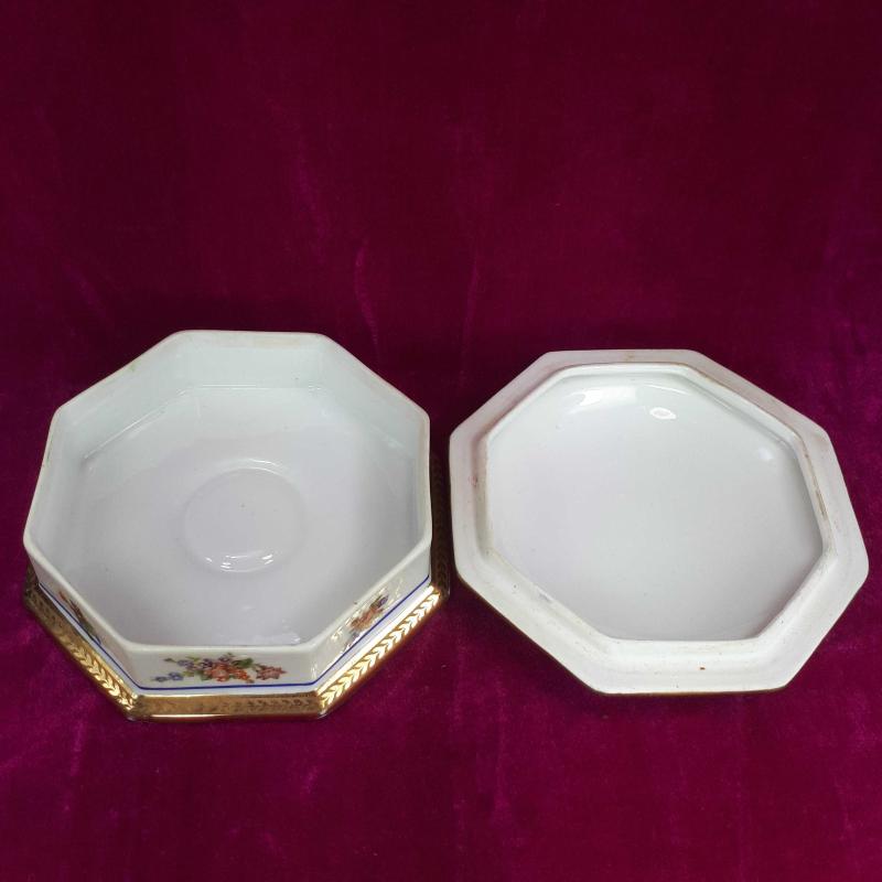 ANTİKA LIMOGES DES FRANCE EL BOYAMA KIR ÇİÇEKLERİ RESİMLİ SEKİZGEN FORMLU , KAPAKLI PORSELEN ÇANAK başlıklı antika/koleksiyon objesi Avrupa menşe’lidir. 1940-1959 arası dönemine aittir.