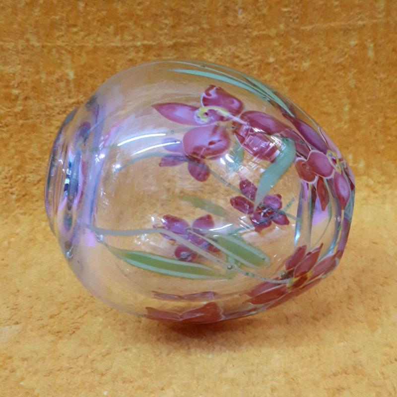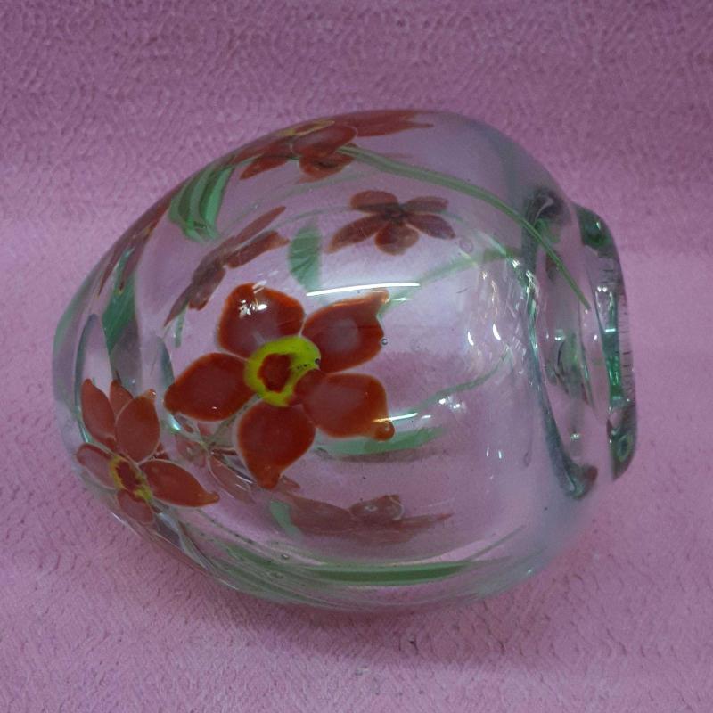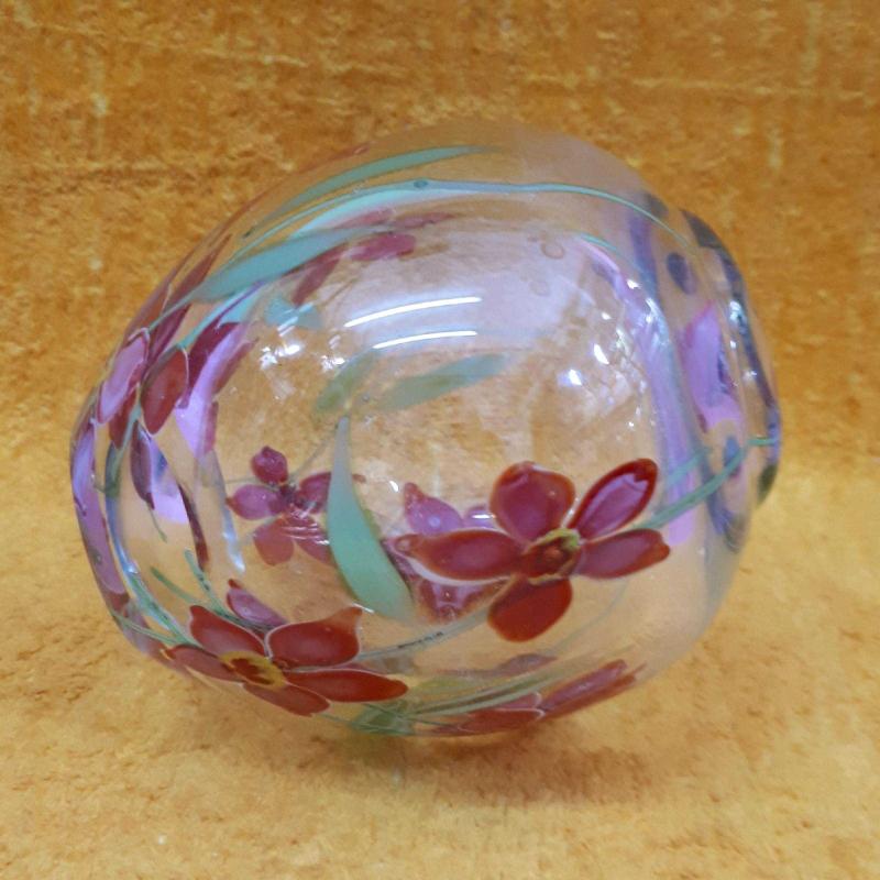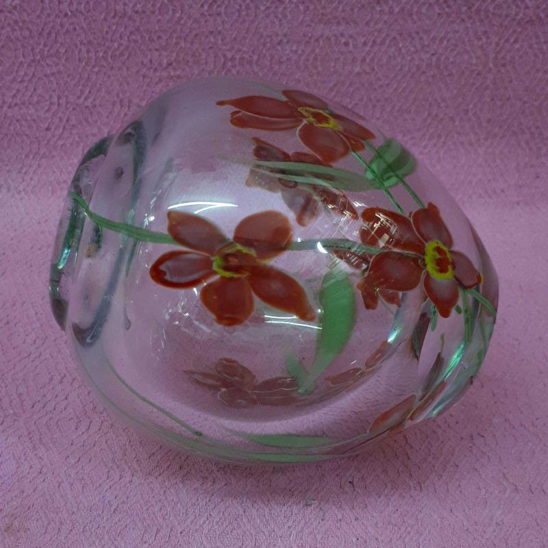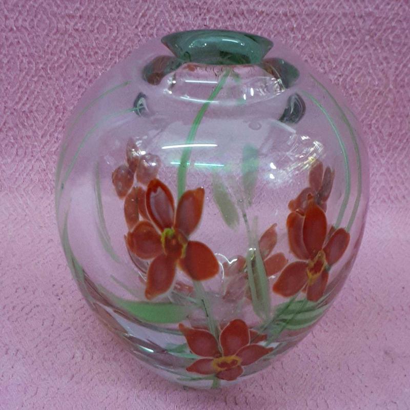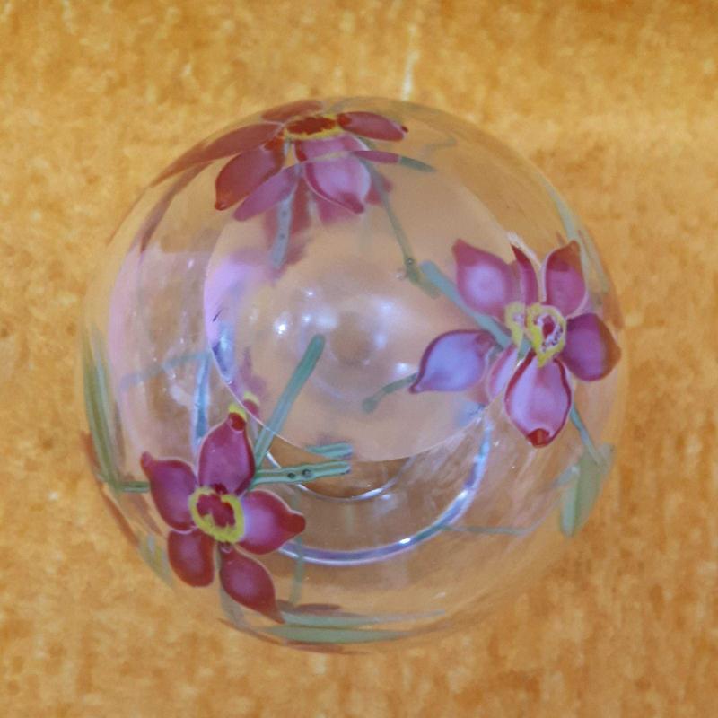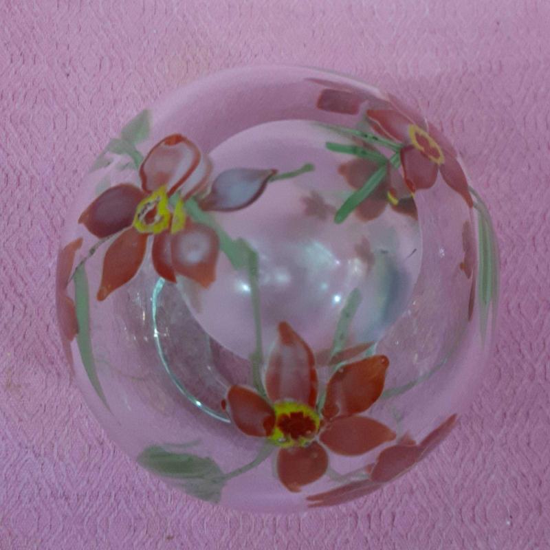 1930 LARDAN . YÜKSEKLİK 13 cm , TAMAMEN EL YAPIMI . CAM ÜZERİNE BOYAMA DEĞİL CAM HAMURUNDAN KIRMIZI YEŞİL RENKLİ KIR ÇİÇEKLERİ RESİMLİ . KUSURSUZ .