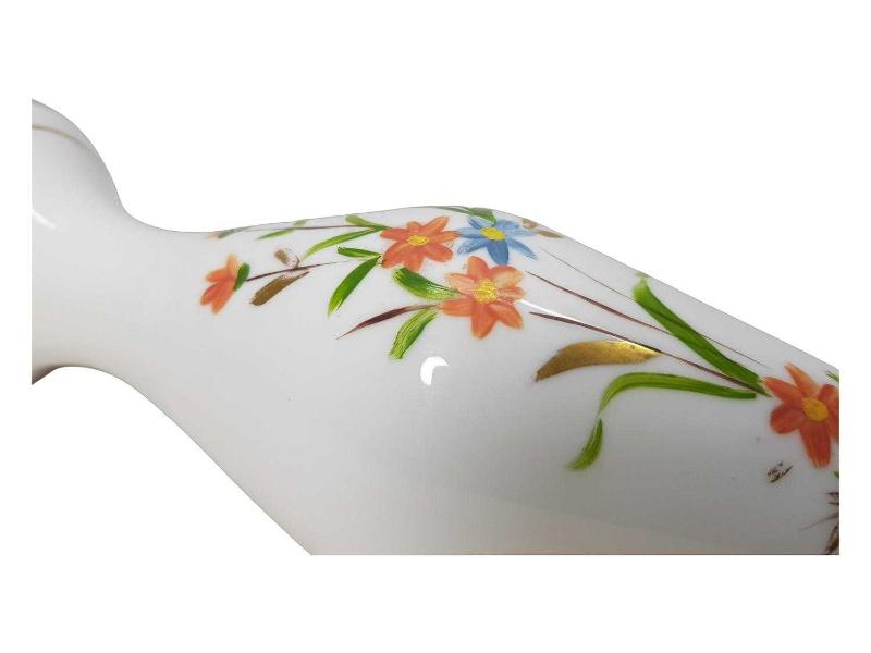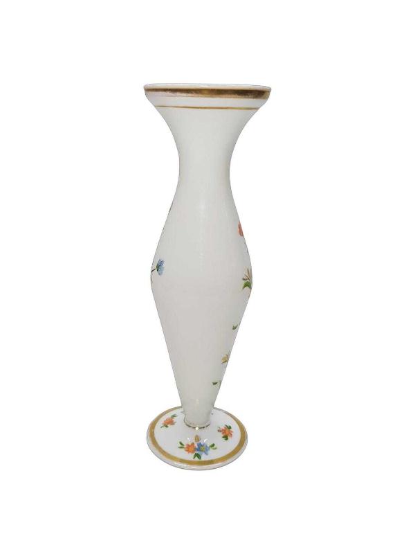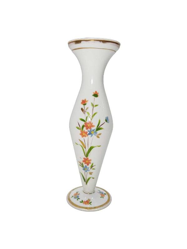 1900'LERDEN ÜZERİ EL BOYAMA ÇİÇEK DESENLERİYLE SÜSLÜ BEYAZ OPAL VAZO. YÜKSEKLİK: 25 CM