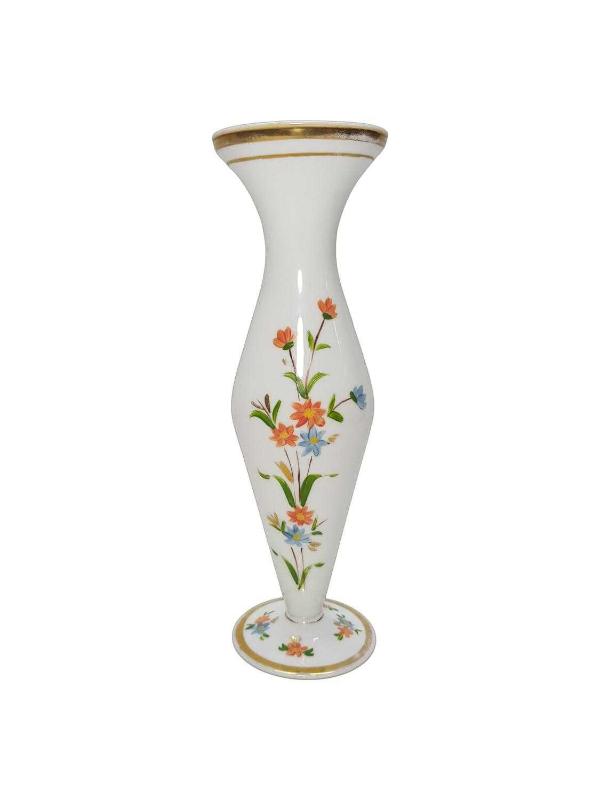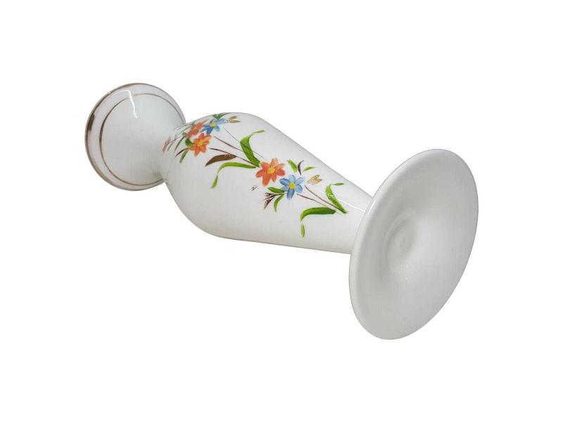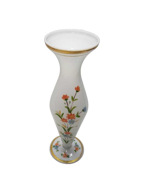 1900'LERDEN ÜZERİ EL BOYAMA ÇİÇEK DESENLERİYLE SÜSLÜ BEYAZ OPAL VAZO. YÜKSEKLİK: 25 CM