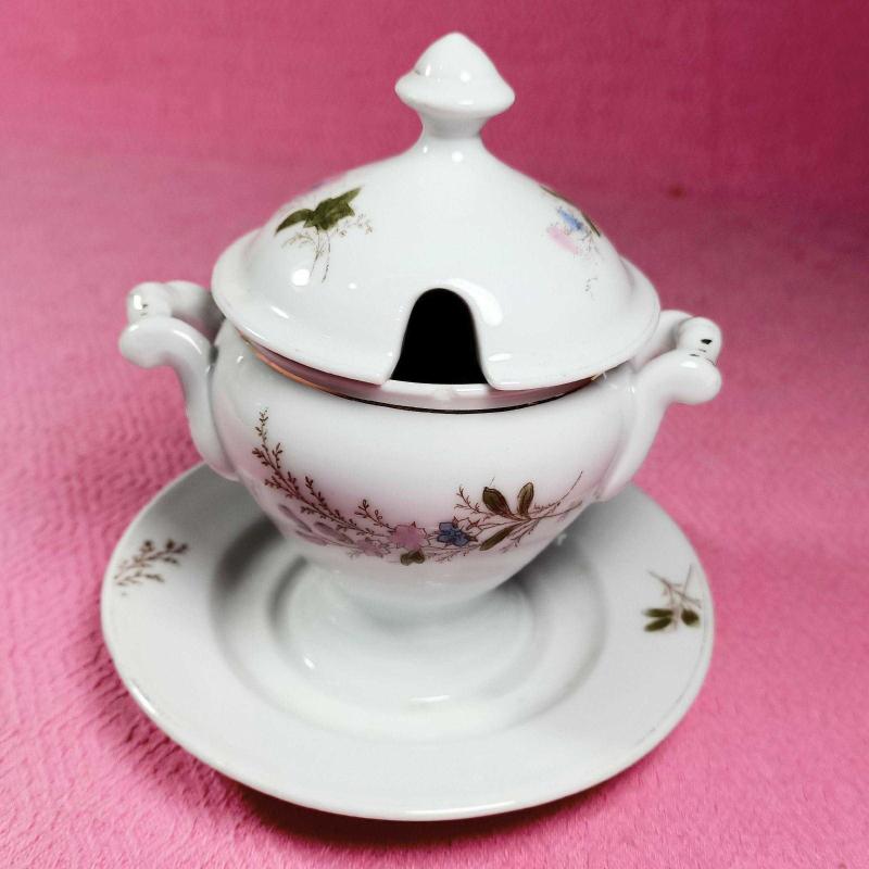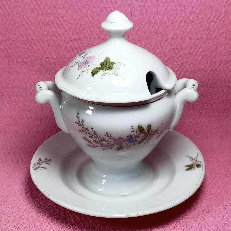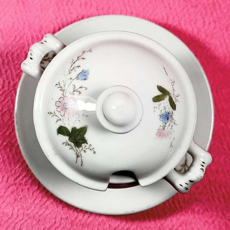 1890 LARDAN . KAPAK DAHİL YÜKSEKLİK VE ALT TABAK ÇAP 13 cm , KIR ÇİÇEKLERİ RESİMLİ , TABAK AĞIZ KENARINDA BELLİ OLMAYAN RÖTUŞLA KAPANABİLİR ÇOK UFAK BİR ATIK VAR . MİNYATÜR KLASİK AYAKLI ÇORBALIK FORMUNDA . ANTİKA .