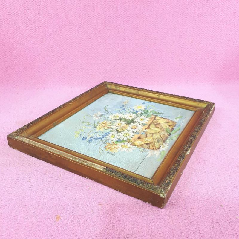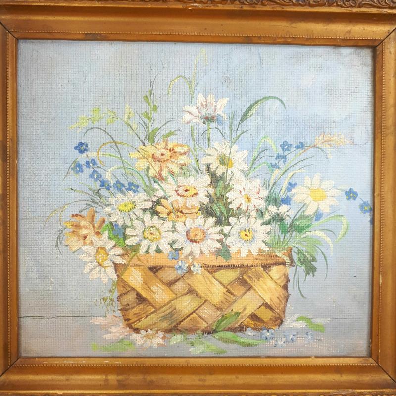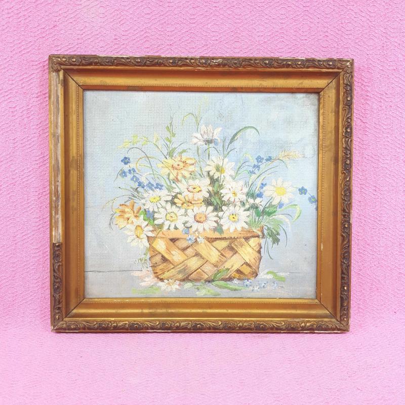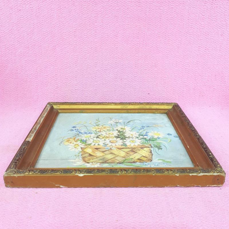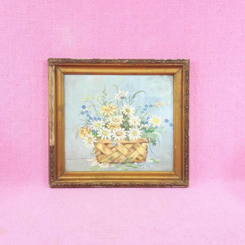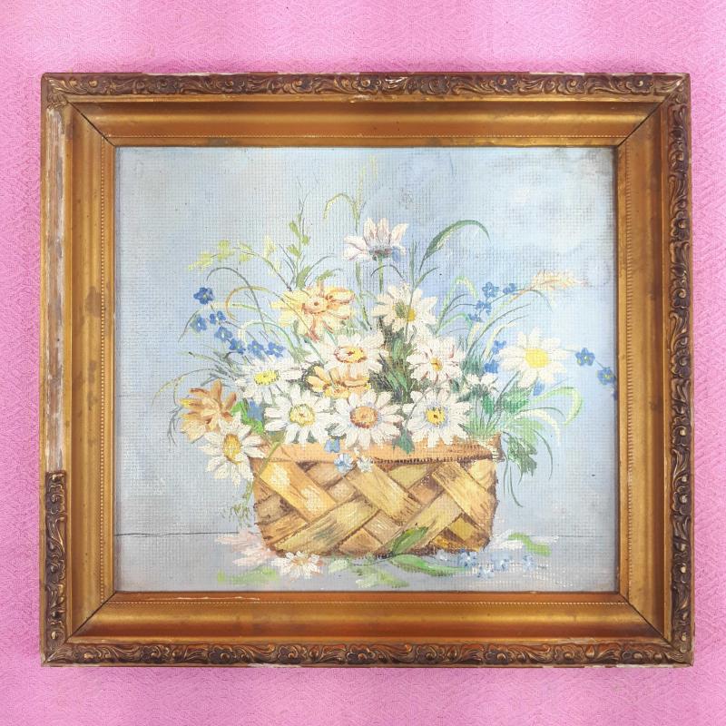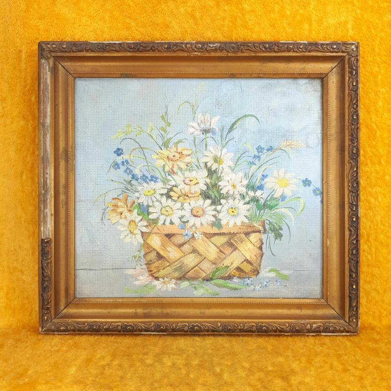ANTİKA SEPETTE PAPATYALAR VE KIR ÇİÇEKLERİ TEMALI NATÜRMORT YAĞLIBOYA RESİM başlıklı antika/koleksiyon objesi Türkiye menşe’lidir. 1940-1959 arası dönemine aittir.