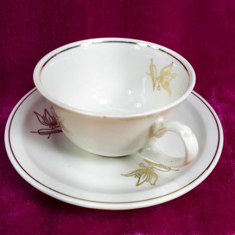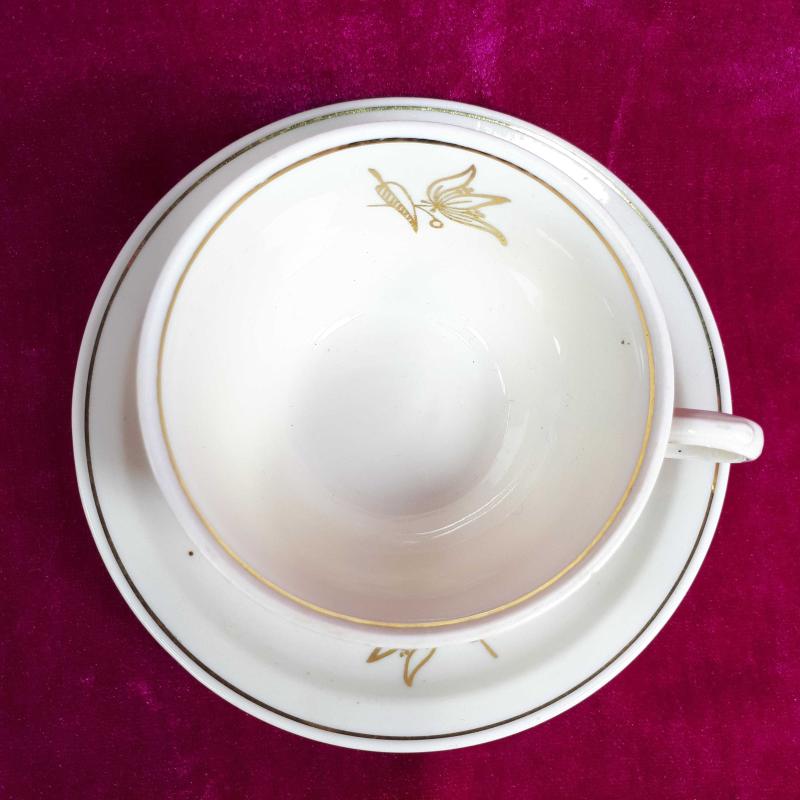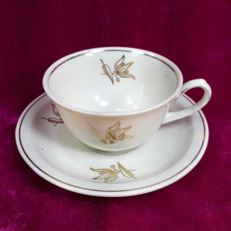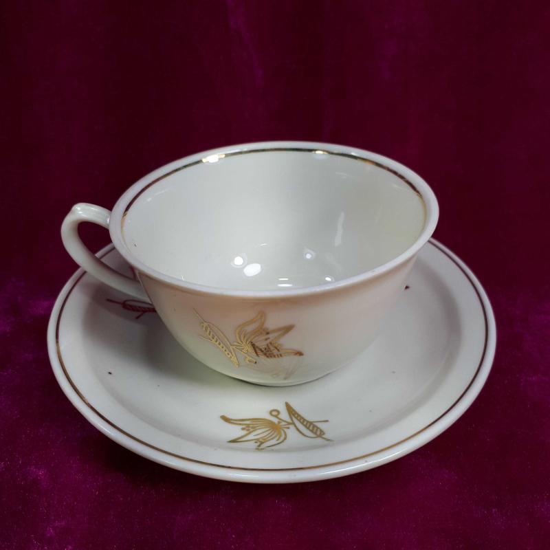 1940 LARDAN . FİNCAN YÜKSEKLİĞİ 4,5 cm , ÇAPI 7,5 cm , TABAK ÇAPI 11,4 cm . ALTIN YALDIZ ELİŞİ DEKORLU . BELLİ OLMAYAN ÇOK KÜÇÜK BİR SIÇRAK HARİCİNDE KUSURSUZ .