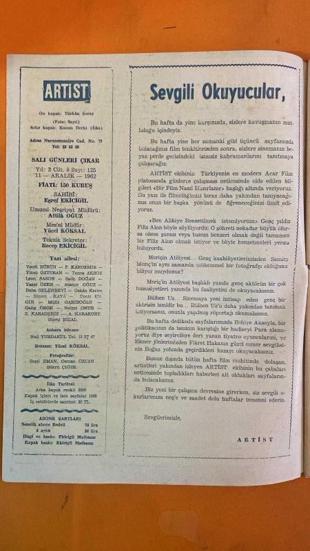 ARTİST SİNEMA, FİLM, TİYATRO, SES, SOSYETE MAGAZİN MECMUASI DERGİSİ - 11 ARALIK 1962 SAYI: 125 TÜRKAN ŞORAY - KANUN DERKİ - EŞREF EKİCİGİL - ATTİLA OĞUZ - YÜCEL KÖKSAL - RECEP EKİCİGİL - VECDİ BURUN - F. KANDEMİR - YÜCEL ÖZTURAN - TUNCA AKSOY - LEON SASON - SADE DOĞAN - YAŞAR ÖZEN - ATANUR OĞUZ - BAHA GELENBEVİ - ÖZKAN KERİM - BİRSEN KAYA - DENİZ ENGİN - MÜFİT GARİBOĞLU - GALİP ÖRGE - NECMİ ONUR - Z. KARADENİZ - A. KARAKURT - HÜROL BİLAL - NAIL YURDAKUL - SAYIL EMAN - OSMAN ÖZCAN - ŞÜKRÜ ÇIĞIR - FİLİZ AKIN - SAMİC MERİÇ - BÜLBEN UZ - BEHİYE AKSOY - FİKRET HAKAN - SAFA ÖNAL - TÜRKER İNANOĞLU - GÖKSEL ARSOY - FATMA GİRİK - SALİH TOZAN - AHMET TARIK TEKÇE - KENAN PARS - AYSEL TANJU - YILMAZ GÜRBÜZ - ANTHONY MOMPLET - RICHARD GARRISON - ISABELLE COREJ - RABIRIUS - IRVING RAPPER - BELINDA LEE - GEOFFREY HORNE - ROBERT MORLEY - VIRA SILENTI - OSMAN F. SEDEN - ÖZTÜRK SERENGİL - SUZAN AVCI - NUR İNSEL - SEVİL CANDAN - VAHİ ÖZ - MÜRÜVVET SİM - MUALLA SÜRER - ALİ ŞEN - EFG - TAM TAKIM - 36 SAYFA, EŞREF EKİCİGİL tarafından kaleme alınmıştır. ARTİST SİNEMA, FİLM, TİYATRO, SES, SOSYETE MAGAZİN MECMUASI DERGİSİ - 11 ARALIK 1962 SAYI: 125 TÜRKAN ŞORAY - KANUN DERKİ - EŞREF EKİCİGİL - ATTİLA OĞUZ - YÜCEL KÖKSAL - RECEP EKİCİGİL - VECDİ BURUN - F. KANDEMİR - YÜCEL ÖZTURAN - TUNCA AKSOY - LEON SASON - SADE DOĞAN - YAŞAR ÖZEN - ATANUR OĞUZ - BAHA GELENBEVİ - ÖZKAN KERİM - BİRSEN KAYA - DENİZ ENGİN - MÜFİT GARİBOĞLU - GALİP ÖRGE - NECMİ ONUR - Z. KARADENİZ - A. KARAKURT - HÜROL BİLAL - NAIL YURDAKUL - SAYIL EMAN - OSMAN ÖZCAN - ŞÜKRÜ ÇIĞIR - FİLİZ AKIN - SAMİC MERİÇ - BÜLBEN UZ - BEHİYE AKSOY - FİKRET HAKAN - SAFA ÖNAL - TÜRKER İNANOĞLU - GÖKSEL ARSOY - FATMA GİRİK - SALİH TOZAN - AHMET TARIK TEKÇE - KENAN PARS - AYSEL TANJU - YILMAZ GÜRBÜZ - ANTHONY MOMPLET - RICHARD GARRISON - ISABELLE COREJ - RABIRIUS - IRVING RAPPER - BELINDA LEE - GEOFFREY HORNE - ROBERT MORLEY - VIRA SILENTI - OSMAN F. SEDEN - ÖZTÜRK SERENGİL - SUZAN AVCI - NUR İNSEL - SEVİL CANDAN - VAHİ ÖZ - MÜRÜVVET SİM - MUALLA SÜRER - ALİ ŞEN - EFG - TAM TAKIM - 36 SAYFA adlı eser Türkçe dilindedir.