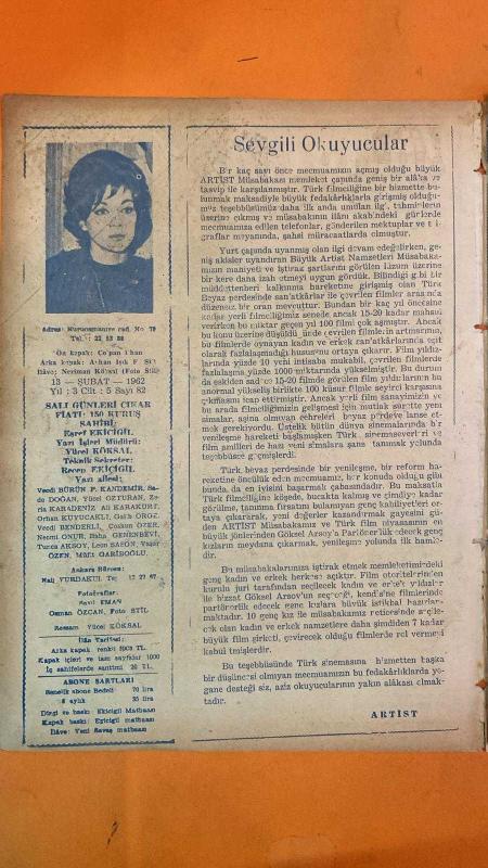 ARTİST SİNEMA, FİLM, TİYATRO, SES, SOSYETE MAGAZİN MECMUASI DERGİSİ - 13 ŞUBAT 1962 SAYI: 82 ÇOLPAN İLHAN - AYHAN IŞIK - NERİMAN KÖKSAL - ESREF EKİCİGİL - YÜCEL KÖKSAL - RECEP EKİCİGİL - VECDİ BURUN - P. KANDEMİR - SADETTİN DOĞAN - YÜCEL ÖZTURAN - ZERİA KARADENİZ - ALTAN KARAKURT - ORHAN KUYUCAKLI - GALİP ÖRGE - VECDİ BENDERLİ - COŞKUN ÖZER - NECMİ ONUR - BAHA GELENBEVİ - TUNCA AKSOY - LEON SASON - YAŞAR ÖZEN - MÜFİT GARİBOĞLU - NAIL YURDAKUL - SAYIL EMAN - OSMAN ÖZCAN - YÜCEL KÖKSAL - SÜHA DOĞAN - ALAETTİN YAVAŞÇA - EFGAN EFEKAN - TÜRKAN ŞORAY - LEYLA SAYAR - HÜSEYİN BARADAN - ATIF KAPTAN - SALİH TOZAN - SEMİH SEZERLİ - ŞAKİR ARSEVEN - İHSAN DEVRİM - YAVUZ CENER - DURSUNE ŞİRİN - MUAMMER GÖZALAN - ÖZDEMİR HAN - ANDRE HUNEBELLE - JEAN MARAIS - ROSSANA SCHIAFFINO - JEAN LOUIS BARRAULT - GÖKSEL ARSOY - GÖNÜL BEYHAN - KADİR SAVUN - AHMET MEKİN - MUHTEREM NUR - IŞIN KAAN - BELGİN DORUK - BEDRİ ÖZDEMİR - ÖZCAN TEKGÜL - ENVER KURÇ - CEMAL GÜVEL - ŞEVKET TEMEL - NAZIM A - TAM TAKIM - 38 SAYFA adlı eser, Kitap > Süreli Yayınlar > Dergiler > Magazin, Moda kategorisinde İkinci El olarak satıştadır.
