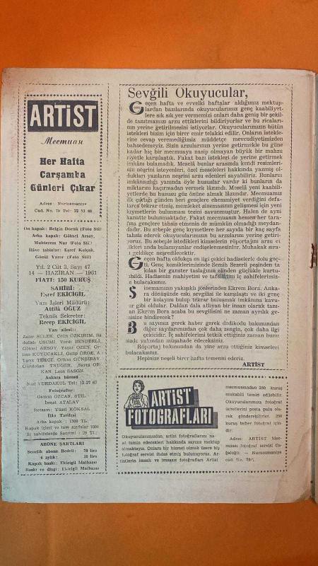 ARTİST SİNEMA, FİLM, TİYATRO, SES, SOSYETE MAGAZİN MECMUASI DERGİSİ - 14 HAZİRAN 1961 SAYI: 47 BELGİN DORUK - GÖKSEL ARSOY - MUHTEREM NUR - EŞREF KOLÇAK - GÖNÜL YAZAR - AHMET MEKİN - LEYLA ALTIN - EŞREF EKİCİGİL - ATTİLA OĞUZ - RECEP EKİCİGİL - ZAFER SULEK - ÇETİN ÖZKIRIM - SADULLAH USUMİ - VECDİ BENDERLİ - YAŞAR ÖZEN - ORHAN KUYUCAKLI - GALİP ÖRGE - A TARIK TEKÇE - ORHAN GÜNŞİRAY - GÜNDOĞAN TUNCER - SAYRA ORKAN - LEON SASON - NAIL YURDAKUL - OSMAN ÖZCAN - İSMET ATALAY - YÜCEL KÖKSAL - SEMİH SEZERLİ - EKREM BORA - SYLVIA PENSES - MEMDUH ÜN - FATMA GİRİK - EFGAN EFEKAN - HAMDİ DEĞİRMENCİOĞLU - PAPATYA KARDEŞLER - ORHAN GÜNŞİRAY - SEVİM EMRE - EKREM BORA - EROL TAŞ - MİLİ - ÖZCAN BİLGE - KENAN PARS - MUZAFFER NEBLİOĞLU - PERİ HAN - VERENO KARDEŞLER - ZEYNEP DEĞİRMENCİOĞLU - FATMA ANDAÇ - SEVİM EMRE - INTERNATIONEL RESTAURANT SAHİBİ - ANKARALI GÜZEL - İSPANYOL YILDIZLAR - PALLADIUM REVÜSÜ SANATKARLARI - TAM TAKIM - 40 SAYFA, EŞREF EKİCİGİL tarafından kaleme alınmıştır. ARTİST SİNEMA, FİLM, TİYATRO, SES, SOSYETE MAGAZİN MECMUASI DERGİSİ - 14 HAZİRAN 1961 SAYI: 47 BELGİN DORUK - GÖKSEL ARSOY - MUHTEREM NUR - EŞREF KOLÇAK - GÖNÜL YAZAR - AHMET MEKİN - LEYLA ALTIN - EŞREF EKİCİGİL - ATTİLA OĞUZ - RECEP EKİCİGİL - ZAFER SULEK - ÇETİN ÖZKIRIM - SADULLAH USUMİ - VECDİ BENDERLİ - YAŞAR ÖZEN - ORHAN KUYUCAKLI - GALİP ÖRGE - A TARIK TEKÇE - ORHAN GÜNŞİRAY - GÜNDOĞAN TUNCER - SAYRA ORKAN - LEON SASON - NAIL YURDAKUL - OSMAN ÖZCAN - İSMET ATALAY - YÜCEL KÖKSAL - SEMİH SEZERLİ - EKREM BORA - SYLVIA PENSES - MEMDUH ÜN - FATMA GİRİK - EFGAN EFEKAN - HAMDİ DEĞİRMENCİOĞLU - PAPATYA KARDEŞLER - ORHAN GÜNŞİRAY - SEVİM EMRE - EKREM BORA - EROL TAŞ - MİLİ - ÖZCAN BİLGE - KENAN PARS - MUZAFFER NEBLİOĞLU - PERİ HAN - VERENO KARDEŞLER - ZEYNEP DEĞİRMENCİOĞLU - FATMA ANDAÇ - SEVİM EMRE - INTERNATIONEL RESTAURANT SAHİBİ - ANKARALI GÜZEL - İSPANYOL YILDIZLAR - PALLADIUM REVÜSÜ SANATKARLARI - TAM TAKIM - 40 SAYFA adlı eser Türkçe dilindedir.