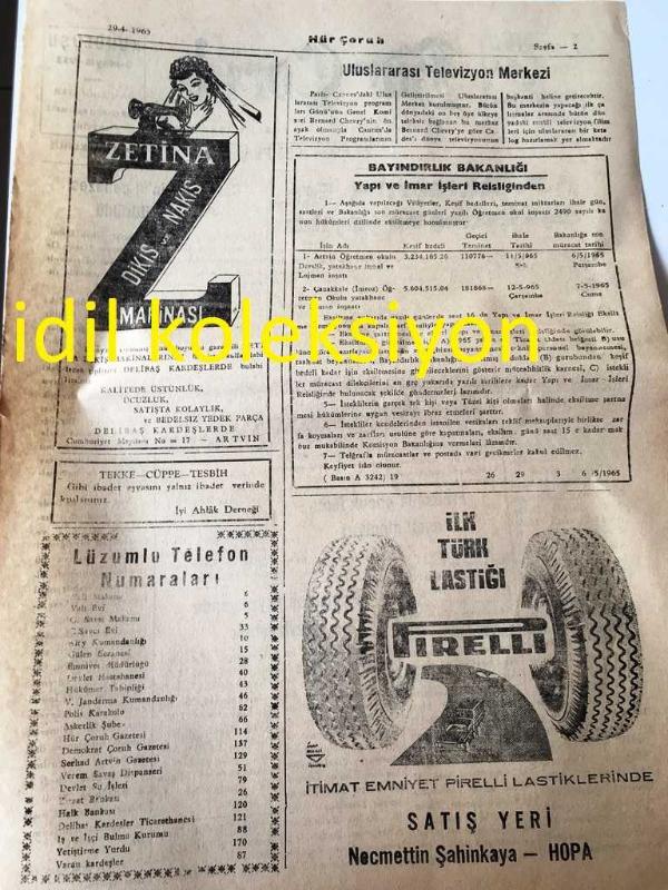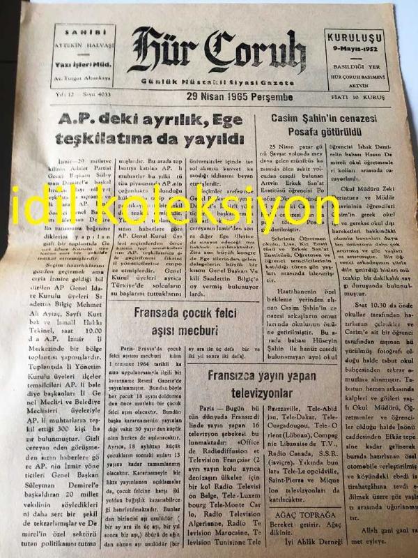 ARTVİN HÜR ÇORUH GAZETESİ YEREL TAŞRA BASINI----29 Nisan 1965 Yıl :12 Sayı :4033 --A.P de ki ayrılık ,Ege teşkilatına da yayıldı --Fransa da çocuk felci aşısı mecburi --Casim Şahin 'in cenazesi Posafa götürüldü --Uluslararası Televizyon Merkezi --- Yıpranma, sararmalar, kupon kesiği ve yırtılmalar zamana bağlı olarak görülebilir.