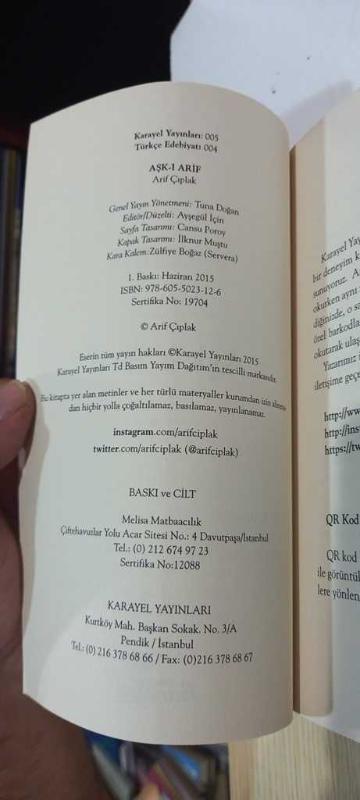 AŞK-I ARİF, Arif Çıplak tarafından kaleme alınmıştır. Kitap 2015 yılında KARAYEL YAYINCILIK tarafından yayınlanmıştır. 126 sayfadır. AŞK-I ARİF adlı eser Türkçe dilindedir.