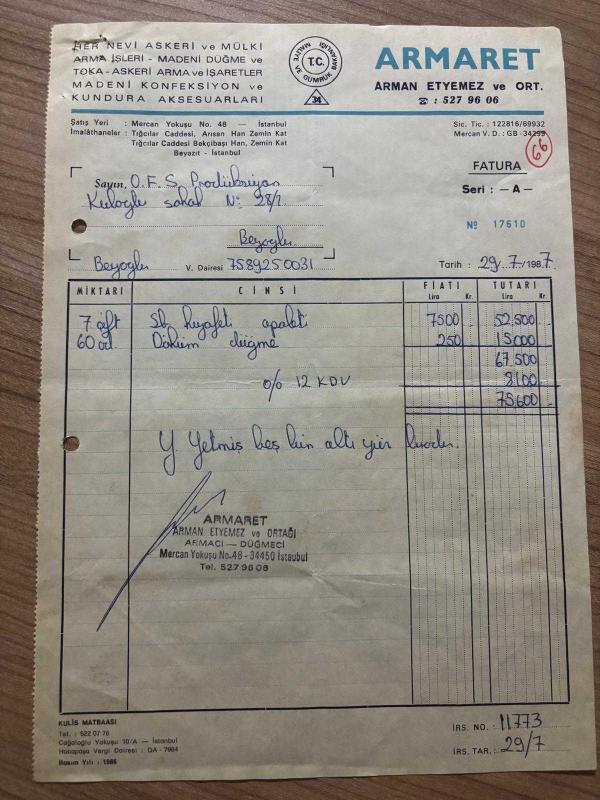 ASKERİ GİYİM FATURASI - 29 TEMMUZ 1987 - ARMARET - ARMAN ETYEMEZ VE ORT. - BEYAZIT, İSTANBUL - OSMAN FAHİR SEDEN, O.F.S. PRODÜKSİYON - BEYOĞLU, İSTANBUL - ISLAK İMZALI, KAŞELİ - 21 x 29 cm EBATLI ORİJİNAL FATURA - TÜRK SİNEMA - FİLM TARİHİ, en son 1 yıl önce güncellenmiştir.