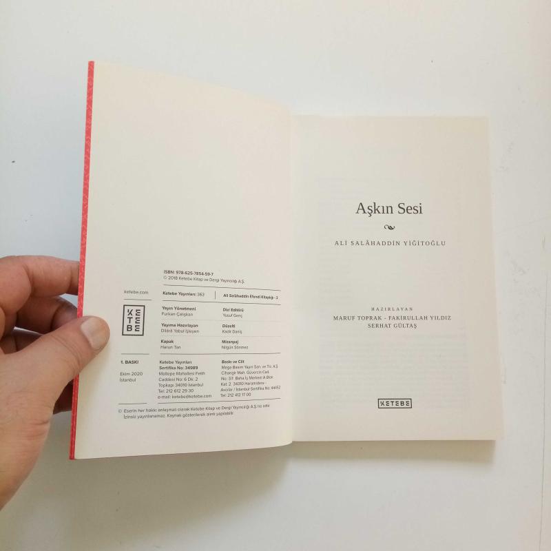 AŞKIN SESİ (2.EL), ALİ SALAHADDİN YİĞİTOĞLU tarafından kaleme alınmıştır. Eser MARUF TOPRAK, FAKİRULLAH YILDIZ, SERHAT GÜLTAŞ editörlüğünde hazırlanmıştır. Kitap 2020 yılında KETEBE YAYINLARI tarafından [ İSTANBUL] 978-625-7854-59-7 ISBN kodu ile yayınlanmıştır. Satışta olan kitap, yayınevinin 1. baskısıdır. 156 sayfadır. Sayfa bilgisi 2. HAMUR olarak belirtilmiştir. AŞKIN SESİ (2.EL) adlı eser Türkçe dilindedir.