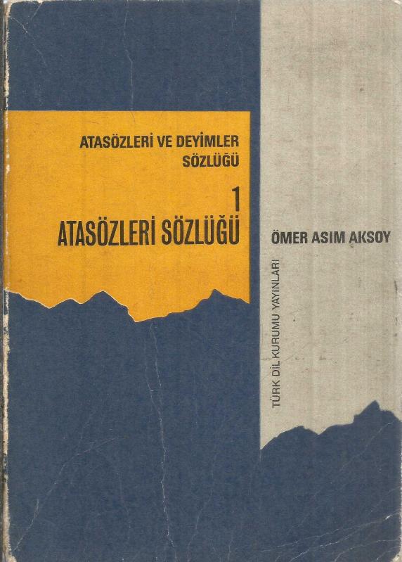 ATASÖZLERİ VE DEYİMLER SÖZLÜGÜ 1 ATASÖZLERİ SÖZLÜGÜ, ÖMER ASIM AKSOY tarafından kaleme alınmıştır. Kitap 1984 yılında TÜRK DİL KURUMU tarafından [ANKARA] yayınlanmıştır. 392 sayfadır. ATASÖZLERİ VE DEYİMLER SÖZLÜGÜ 1 ATASÖZLERİ SÖZLÜGÜ adlı eser Türkçe dilindedir.
