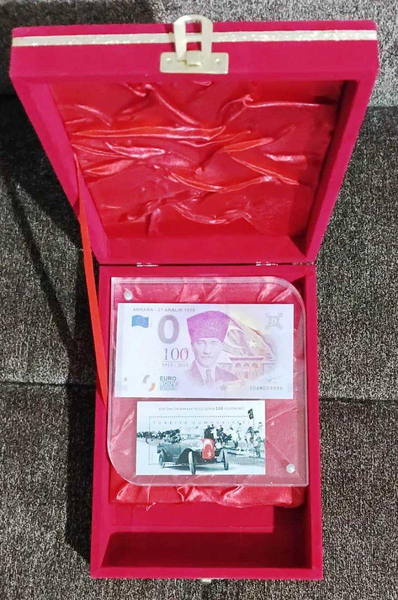 ATATÜRK'ÜN ANKARA'YA GELİŞİ 0 EURO VE PTT PULU KADİFE PLAKET