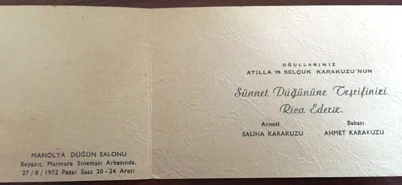 ATİLLA KARAKUZU ve SELÇUK KARAKUZU'NUN 27 AĞUSTOS 1972 PAZAR TARİHLİ SÜNNET DÜĞÜNÜ DAVETİYESİ, MANOLYA DÜĞÜN SALONU, en son 2 yıl önce güncellenmiştir.
