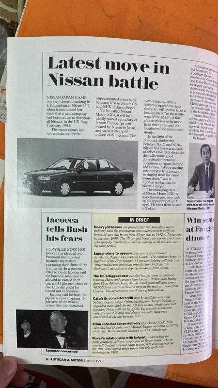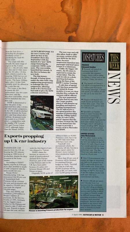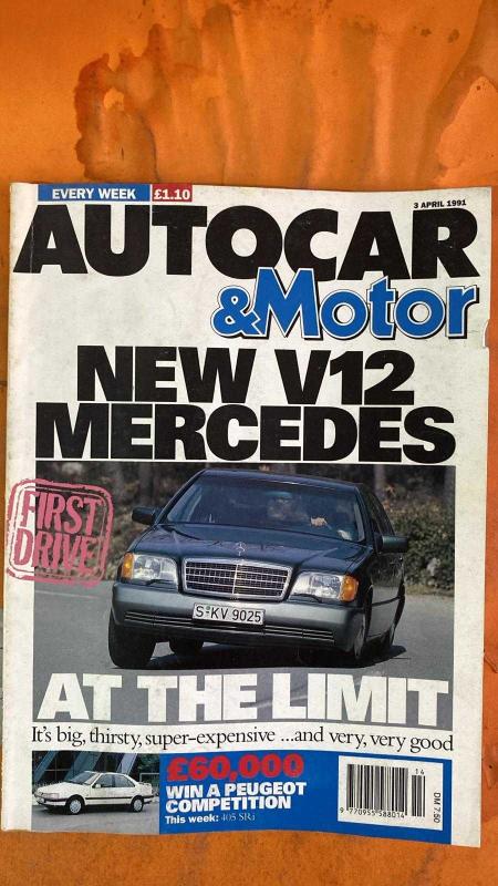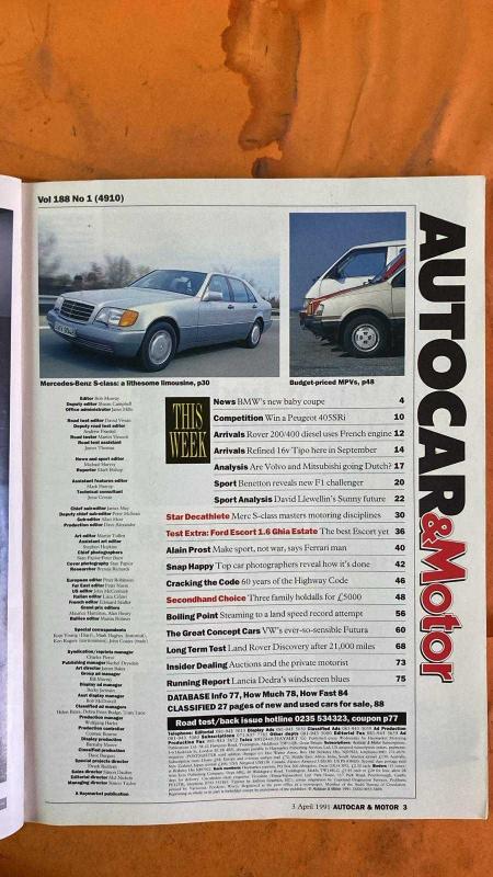 AUTOCAR & MOTOR DERGİSİ - 3 NİSAN 1991 MERCEDES-BENZ - BMW - AUDI - NISSAN - VAUXHALL - RENAULT - CITROEN - PEUGEOT - MATRA - FORD - VW - CHRYSLER **YENİ V12 MERCEDES S-CLASS’IN İLK SÜRÜŞÜ - £60,000’LIK LİMUZİNİN ÜSTÜN KONFORU VE PERFORMANSI - BMW’NİN E36 COUPE MOTOR YELPAZESİ VE M3 YERİNE GEÇECEK MODELİN İKİ YIL SONRA GELMESİ - AUDI’NİN FRANKFURT’TA TANITACAĞI YENİ 80/90 SERİSİ VE YATAY YAKIT DEPOSU SAYESİNDE GENİŞ BAGAJ HACMİ - S2 COUPE’YE YAZ AYLARINDA 230BHP’LİK 20-VALF TURBO VE 6-İLERİ ŞANZIMAN GELİYOR - 2.8L V6 MOTORLA MERCEDES VE BMW’YE LÜKS RAKİP HEDEFİ - NISSAN’IN SUNDERLAND’DAKİ PRIMERA ÜRETİMİNİ 120,000 ARAÇ/YIL HEDEFİYLE ARTIRMASI VE %80’İNİN İHRACATA GİTMESİ - 1991’DE ALMANYA’YA 27,000 PRIMERA İHRACATI PLANLANMASI - TAYVAN’A İLK SEVKİYATIN BAŞLAMASI - VAUXHALL FRONTERA’NIN %80’İNİN AVRUPA’YA OPEL OLARAK İHRAÇ EDİLECEĞİ VE LUTON’DA YILLIK 40,000 ÜRETİM HEDEFİ - RENAULT R19 CONVERTIBLE’IN YAZ AYLARINDA KARMANN İŞBİRLİĞİYLE GELMESİ - 80BHP’LİK 1.4 VE 140BHP’LİK - 114 SAYFA