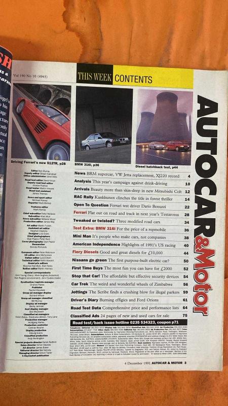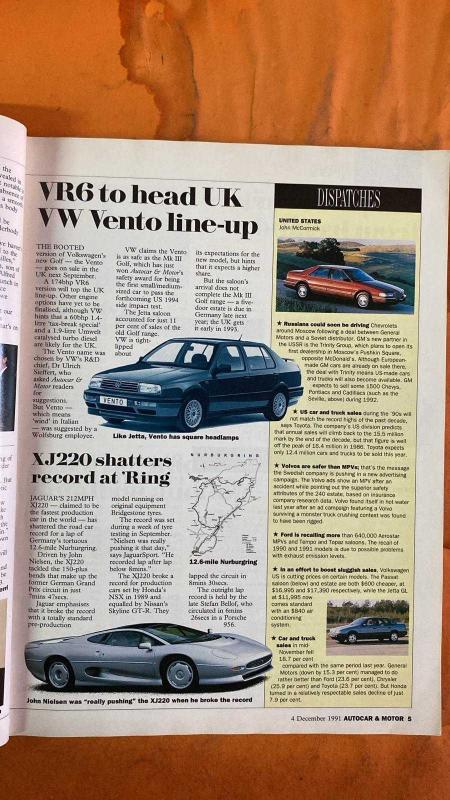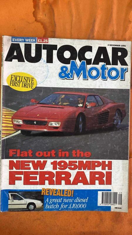 AUTOCAR & MOTOR DERGİSİ - 4 ARALIK 1991 – AUTOCAR & MOTOR FERRARI 512TR - BMW 316i - VW VENTO VR6 - JAGUAR XJ220 - HONDA NSX - NISSAN SKYLINE GT-R - GENERAL MOTORS - TRINITY GROUP - CHEVROLET - PONTIAC - CADILLAC - TOYOTA - VOLVO 240 ESTATE - FORD AEROSTAR - FORD TEMPO - FORD TOPAZ - VOLKSWAGEN PASSAT - VOLKSWAGEN JETTA - LAMBORGHINI - BMW FERRARI 512TR’NİN İLK SÜRÜŞÜ VE 195MPH HIZ TESTİ - BMW 316i TESTİ VE FİYAT/PERFORMANS DEĞERLENDİRMESİ - VW VENTO’NUN 174BHP VR6 VERSİYONUYLA UK PAZARINA GİRİŞİ VE 1994 YAN DARBE TESTİNE UYGUNLUK ÖDÜLÜ - JAGUAR XJ220’NİN NÜRBURGRING’DE 7 DAKİKA 47 SANİYEYLE ÜRETİM ARAÇLARI REKORUNU KIRMASI - HONDA NSX VE NISSAN SKYLINE GT-R’NİN ÖNCEKİ REKORLARI - GENERAL MOTORS’UN TRINITY GROUP İLE MOSKOVA’DA PUSHKIN MEYDANI’NDA İLK BAYİSİNİ AÇMASI VE 1992’DE 1500 ARAÇLIK SATIŞ HEDEFİ - TOYOTA’NIN 1990’LARDA ABD SATIŞLARINDA 15.5 MİLYON HEDEFİ VE 1986’DAKİ 16.4 MİLYONLUK ZİRVEYE GERİ DÖNEMEMESİ - VOLVO’NUN 240 ESTATE MODELİNİ MPV’LERE KIYASLA DAHA GÜVEN - 98 SAYFA adlı eser İngilizce dilindedir.