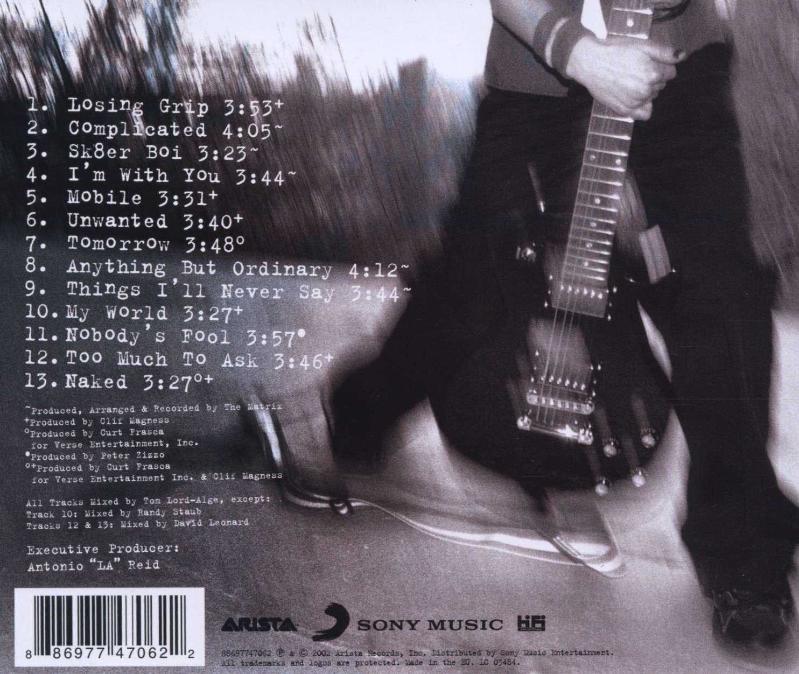 1 Losing Grip 3:53 2 Complicated 4:05 3 Sk8er Boi 3:23 4 I'm With You 3:44 5 Mobile 3:31 6 Unwanted 3:40 7 Tomorrow 3:48 8 Anything But Ordinary 4:12 9 Things I'll Never Say 3:44 10 My World 3:27 11 Nobody's Fool 3:57 12 Too Much To Ask 3:46 13 Naked 3:27 2002 CD