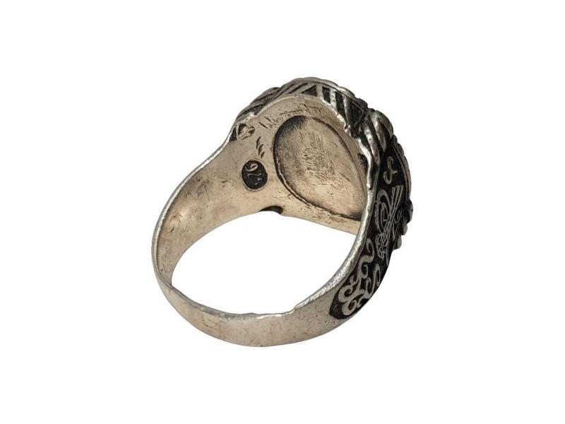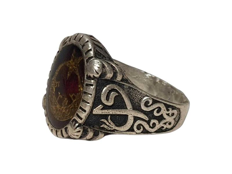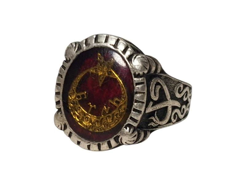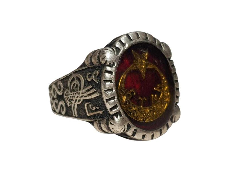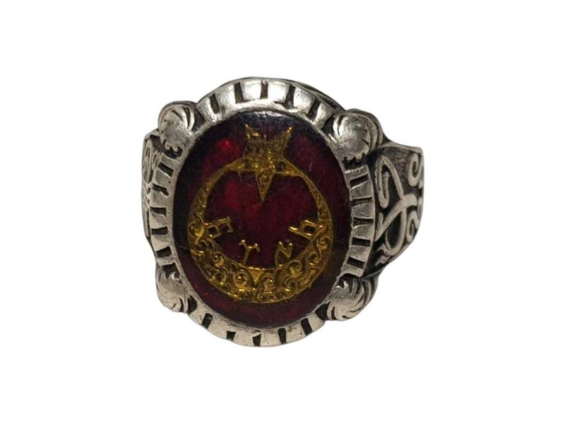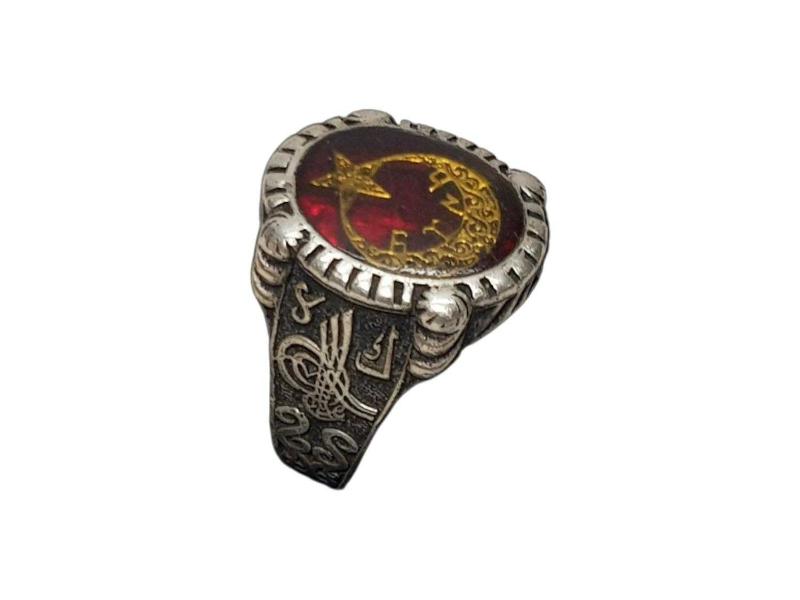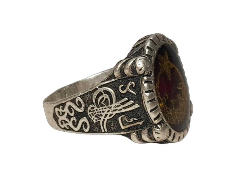 TACINDA AY YILDIZ RESMİ İLE RUNİK HARFLERLE TÜRK YAZISI, BİR KENARINDA OSMANLI TUĞRASI İLE KEF VE LAMELİF HARFLERİ İLE DİĞER KENARINDA ELİF VE VAV HARFLERİ BULUNAN 925 AYAR GÜMÜŞ ERKEK YÜZÜĞÜ.