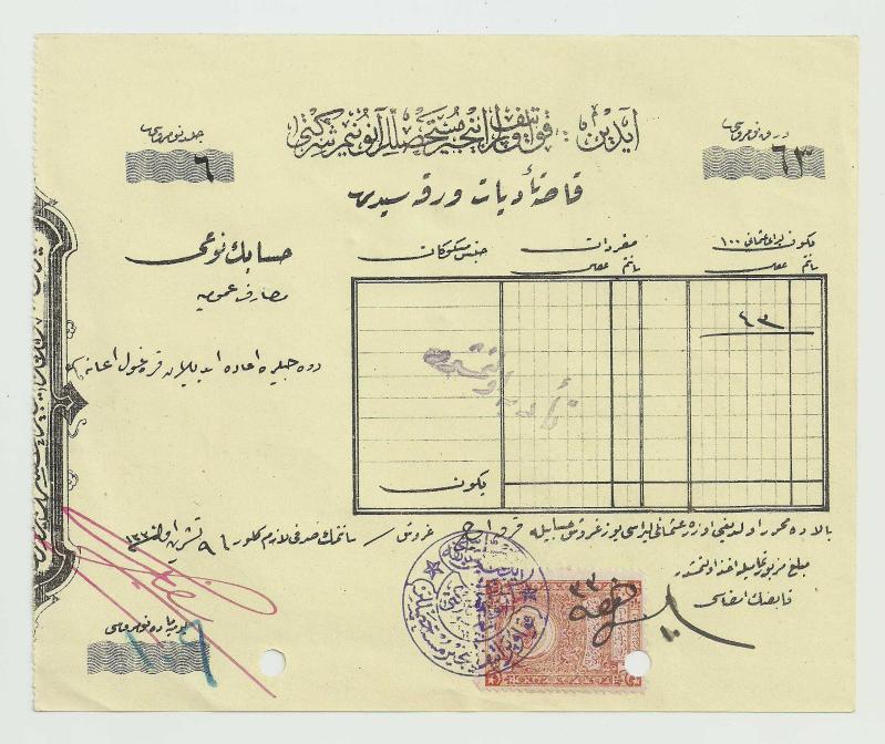 ** AYDIN KOOPERATİFLER İNCİR MÜSTAHSİLLERİ ANONİM ŞİRKETİ / 1904 KASA TEDİYAT VARAKASI ** Çok temiz durumda,altta damgası çok net,pulu üzerinde,dosyalandığı için delgeç delikli, Aydın vilayetinden incir temalı Osmanlıca makbuzdur...