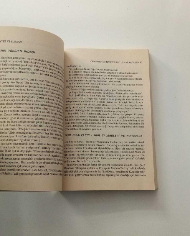 AYET VE SLOGAN (TÜRKİYEDE İSLAMİ OLUŞUMLAR) - RUŞEN ÇAKIR METİS YAYINLARI 303 SAYFA 13 x 19.5 CM. 1995 YILI BASIMI, 8.BASKI, KİTABIN DURUMU RESİMDE GÖRÜLDÜĞÜ GİBİ ÜCRETSİZ KARGO Ayet ve Slogan, ilk kez 1990 yılından yayımlandı ve kısa sürede konusunda bir klasik haline geldi. Ruşen Çakır, gazeteci ve araştırmacı olarak İslami oluşumlara bakarken, alışılmış bakış açılarını ve klişeleri reddetmiş, konusuna dokunmayı, konusuyla gerçekten ilişkiye geçmeyi tercih etmişti. Ayet ve Slogan'ı böylesine başarılı kılan da bu oldu... Şerif Mardin kitabın 9. Basımı için kaleme aldığı Sunuş'ta şöyle yazıyor: Çakırın araştırmaları En az altı örgün araştırma alanına ışık getirmiştir: Türkiye'de İslamlığın liderliğinin kimler tarafından oluşturulduğu; siyasetle olan ilişkileri; İslami teşkilatlanmanın sınırında etkili olan ancak icazetli sayılması mümkün olmayan aydınların fikirlerinin ülkemizde islamı nasıl etkilediği; liderlerin, bu aydınların da fikirleriyle dini inançları bugünkü bilgi çerçevemizi kullanarak yeni ve ideolojik bir söylemle nasıl yoğurdukları; Türkiye'de ancak bölük pörçük bilgilerle yazıya aktarılan tarikatların yaygın etkisi...