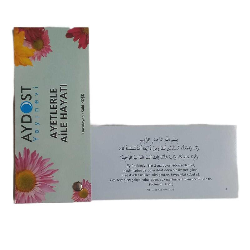 AYETLERLE AİLE HAYATI KARTELA Dil: ARAPÇA,TÜRKÇE Sayfa Sayısı: 40 Cilt Tipi: karton kapak Kağıt Cinsi: Kuşe Boyut: 5,5 x 12,5 cm