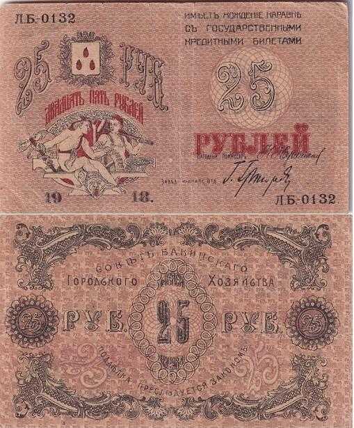 RUSYA AZERBAYCANI - BAKÜ 25 RUBLE 1918 TEMİZ+ / ÇT KONDÜSYON (7.0), RESİMDEKİ PARA GÖNDERİLECEKTİR.