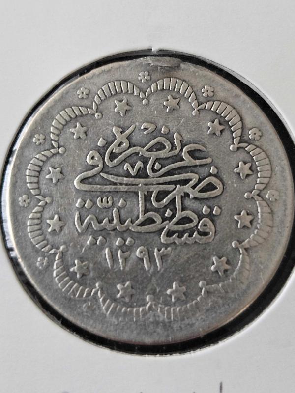 Sultan Abdülhamid dönemi 1293/18 Cülüs 3 Nadir Çok çok kıymetli Gümüş Kulp çıkması 5 Kuruştur. Basım adedi sadece 12.000 dir. Kulp izi mevcuttur. Kondisyonu resimlerdeki gibidir.