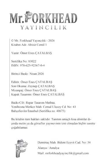 Abisiz Cemil 1 (KİŞİYE ÖZEL İMZALI), Ömer Enes ÇATALBAŞ tarafından kaleme alınmıştır. Kitap 2026 yılında Mr. Forkhead Yayıncılık tarafından 978-625-92367-0-4 ISBN kodu ile yayınlanmıştır. Satışta olan kitap, yayınevinin 1. baskısıdır. 312 sayfadır. Abisiz Cemil 1 (KİŞİYE ÖZEL İMZALI) adlı eser Türkçe dilindedir.