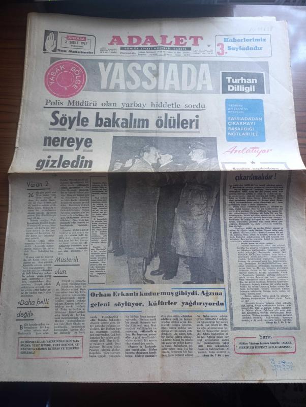 Adalet Gazetesi - 2 Şubat 1967 - yasak bölge yassıada yazan Turhan Dilligil - polis müdürü olan yarbay hiddetle sordu söyle bakalım ölüleri nereye gizledin - Adnan Menderes Türk subayına ve bütünüyle Türk ordusuna toz kondurulmasına tahammül edemezdi Fotoğrafı - Orhan Erkanlı kudurmuş gibiydi ağzına geleni söylüyor küfürler yağdırıyordu - Tekel içkiye ve sigaraya zam yaptı - gençlik dün komünizmi telin etti - Sevda Aydan Budapeşte operasında oynayacak - 300 kişiyi YTP'den ayrılarak Adalet partisine geçti - Çetin Altan hakkında 5 dava açıldı - Türkiye'de Kızıl ajanlar nakleden M. Kenan Par yazı dizisi - Kafiristan - burç falınız - Durakpaşa dershanesi - ilkbahar defileleri - Avrupa Milletler Kupası maçında İspanya ile yenişemedik - Adalet at yarışları - Göztepeliler Fenerbahçe'yi yenip lider olacağız diyor - Sultan Aziz'in başpehlivanı Kavasoğlu Koca İbrahim Yazan Kispetlioğlu - Ali Sami Yen stadı - Kurtdereli Mehmet pehlivanı yaşatırken Koç Mehmet ve Kara Ahmet unutulmamalı, Turhan Dilligil tarafından kaleme alınmıştır. Adalet Gazetesi - 2 Şubat 1967 - yasak bölge yassıada yazan Turhan Dilligil - polis müdürü olan yarbay hiddetle sordu söyle bakalım ölüleri nereye gizledin - Adnan Menderes Türk subayına ve bütünüyle Türk ordusuna toz kondurulmasına tahammül edemezdi Fotoğrafı - Orhan Erkanlı kudurmuş gibiydi ağzına geleni söylüyor küfürler yağdırıyordu - Tekel içkiye ve sigaraya zam yaptı - gençlik dün komünizmi telin etti - Sevda Aydan Budapeşte operasında oynayacak - 300 kişiyi YTP'den ayrılarak Adalet partisine geçti - Çetin Altan hakkında 5 dava açıldı - Türkiye'de Kızıl ajanlar nakleden M. Kenan Par yazı dizisi - Kafiristan - burç falınız - Durakpaşa dershanesi - ilkbahar defileleri - Avrupa Milletler Kupası maçında İspanya ile yenişemedik - Adalet at yarışları - Göztepeliler Fenerbahçe'yi yenip lider olacağız diyor - Sultan Aziz'in başpehlivanı Kavasoğlu Koca İbrahim Yazan Kispetlioğlu - Ali Sami Yen stadı - Kurtdereli Mehmet pehlivanı yaşatırken Koç Mehmet ve Kara Ahmet unutulmamalı adlı eser Türkçe dilindedir.