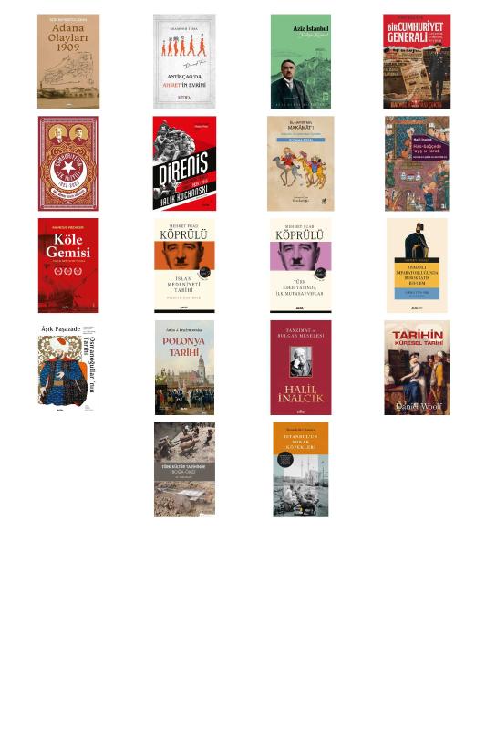 Adana Olayları 1909 - Antikçağ'da Ahiret'in Evrimi - Aziz İstanbul - Bir Cumhuriyet Generali - Cumhuriyet'in İlk Yüzyılı - Direniş - El-Hariri’nin Makamat’ı Boyama Kitabı - Has-Bağçede Ayş u Tarab - Köle Gemisi - Mehmet Fuad Köprülü Külliyat 2 - Mehmet Fuad Köprülü Külliyat 4 - Osmanlı İmparatorluğunda Bürokratik Reform - Osmanoğulları’nın Tarihi (Ciltli) - Polonya Tarihi - Tanzimat ve Bulgar Meselesi - Tarihin Küresel Tarihi (Ciltli) - Türk Kültür Tarihinde Boğa - Öküz - İstanbul’un Sokak Köpekleri