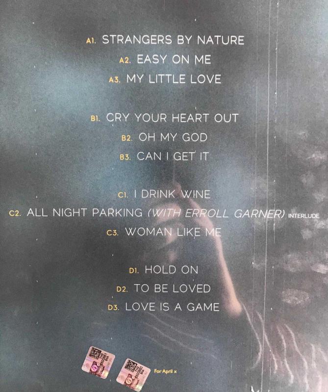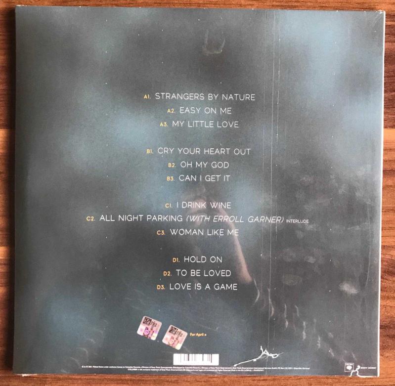 2021 Avrupa baskı olan albüm, orjinal ambalajında açılmamış, kullanılmamıştır. Fotoğrafların hepsi plakların orjinal fotoğraflarıdır. Tüm plaklar özel plak kutusunda, aksi belirtilmedikçe yurtiçi veya aras kargo ile gönderilir. Kondisyon: Ambalajında (S.S) Label: Columbia – 19439937971, Sony Music – 19439937971 Format: 2 x Vinyl, LP, Album, 180g, MPO Country: Europe Released: Nov 19, 2021 Genre: Funk / Soul, Blues, Pop Style: Ballad, Neo Soul, Piano Blue Albüm İçeriği; A1 Strangers By Nature A2 Easy On Me A3 My Little Love B1 Cry Your Heart Out B2 Oh My God B3 Can I Get It C1 I Drink Wine C2 All Night Parking (Interlude) C3 Woman Like Me D1 Hold On D2 To Be Loved D3 Love Is A Game